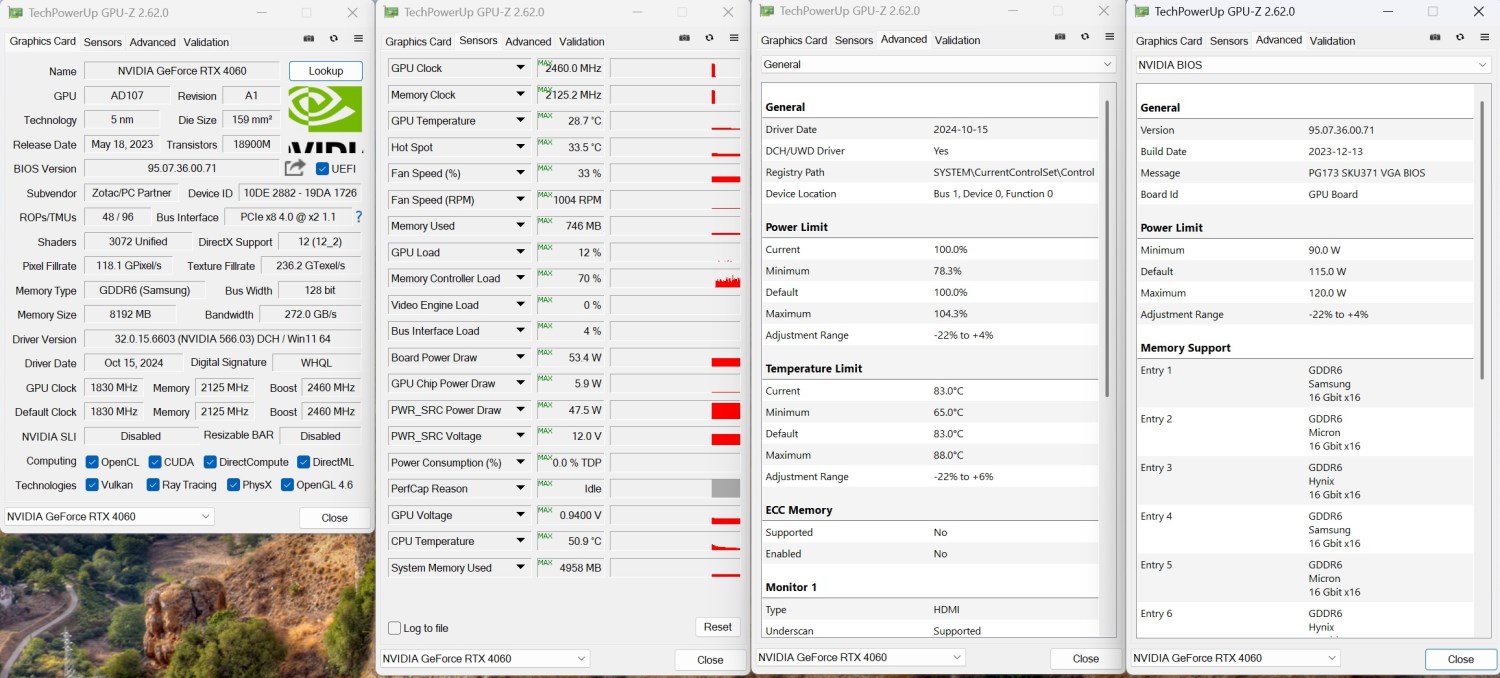 - GeForce RTX 4060 (1830 / 2595 / 2125 МГц (ядро/boost/память));