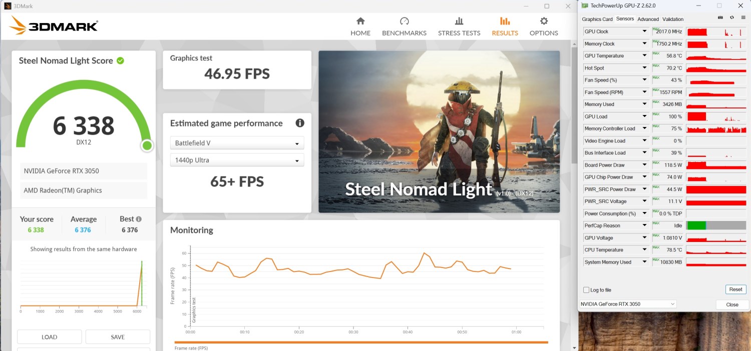 Теперь посмотрим на нагрев MSI GeForce RTX 3050 Ventus 2X XS White 8G во время интенсивной нагрузки.