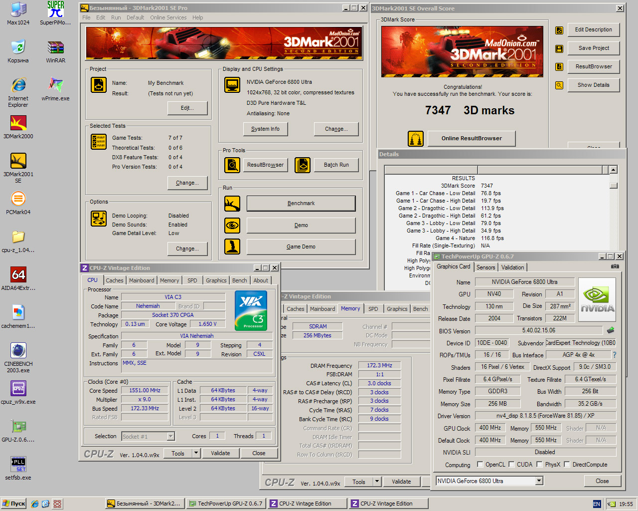 Странно, конечно, представить конфигурацию процессора VIA C3 и GeForce 6800 Ultra, но это сборка вполне жизнеспособна. Впервые VIA C3 на штатных настройках обошел Celeron 800 МГц, на 1550 МГц остался позади Celeron 1000 МГц, на 1600 МГц удалось обойти Pentium-3 800EB и Celeron 1000A (Tualatin-256).