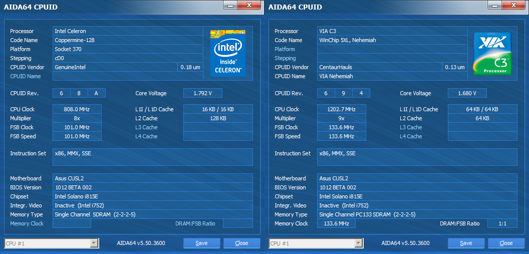В качестве материнской платы для запуска VIA C3 1.2 ГГц использовалась модель ASUS СUSL2 с набором системной логики 815EP. Для процессоров на ядре Tualatin использовалась ASUS TUSL2-C, чипсет 815EP Step-B.
