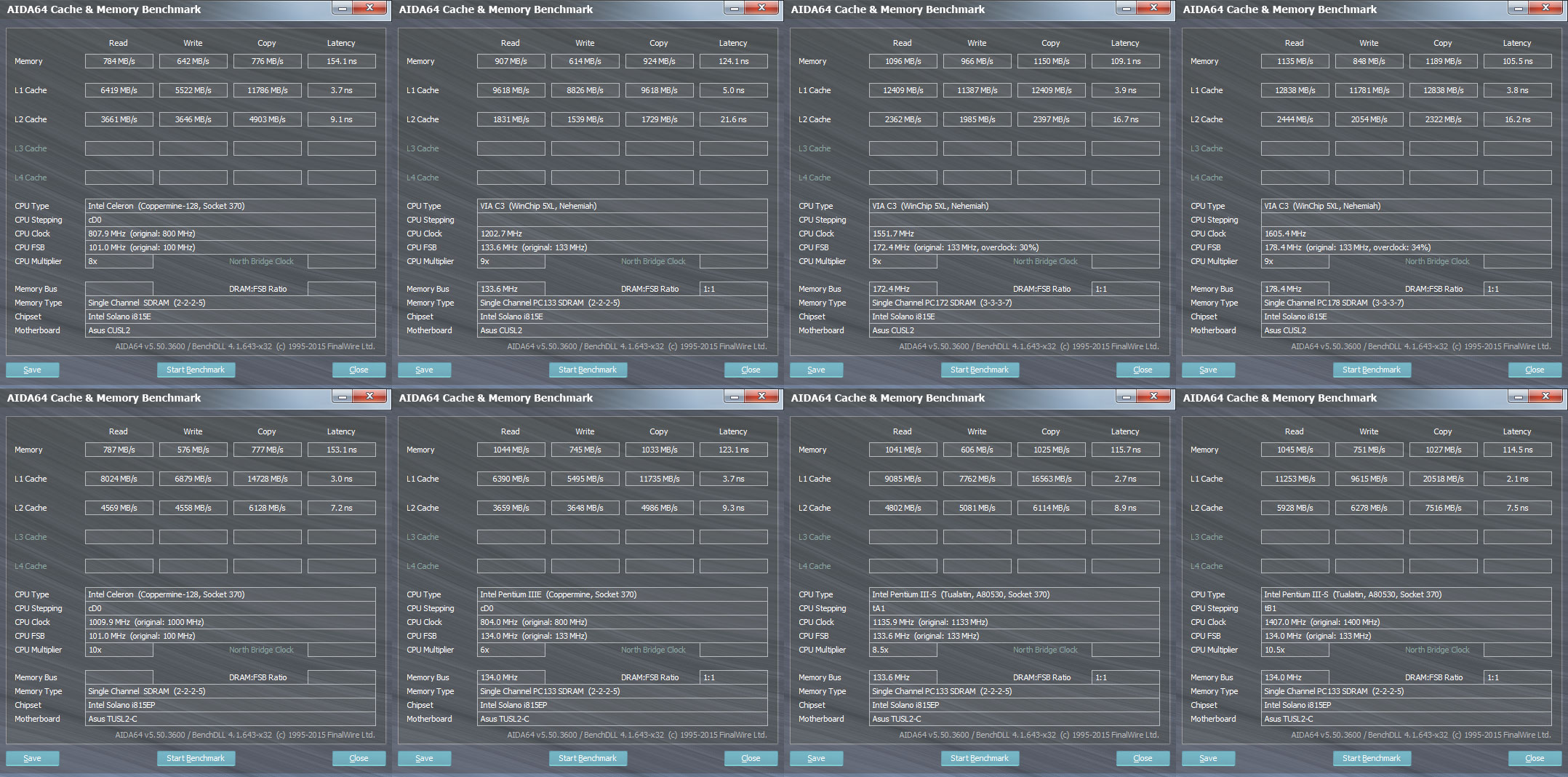 И в завершении результаты работы оперативной памяти. Понятное дело, что это лишь красивые цифры, но они также внесли свой вклад в общую производительность. За счет более высокой частоты системной шины и оперативной памяти удалось обогнать все модели Intel Celeron. Разгон и вовсе сделал процессоры VIA C3 королями производительности, но не стоит забывать, что и Celeron, и Pentium III также поддаются разгону.
