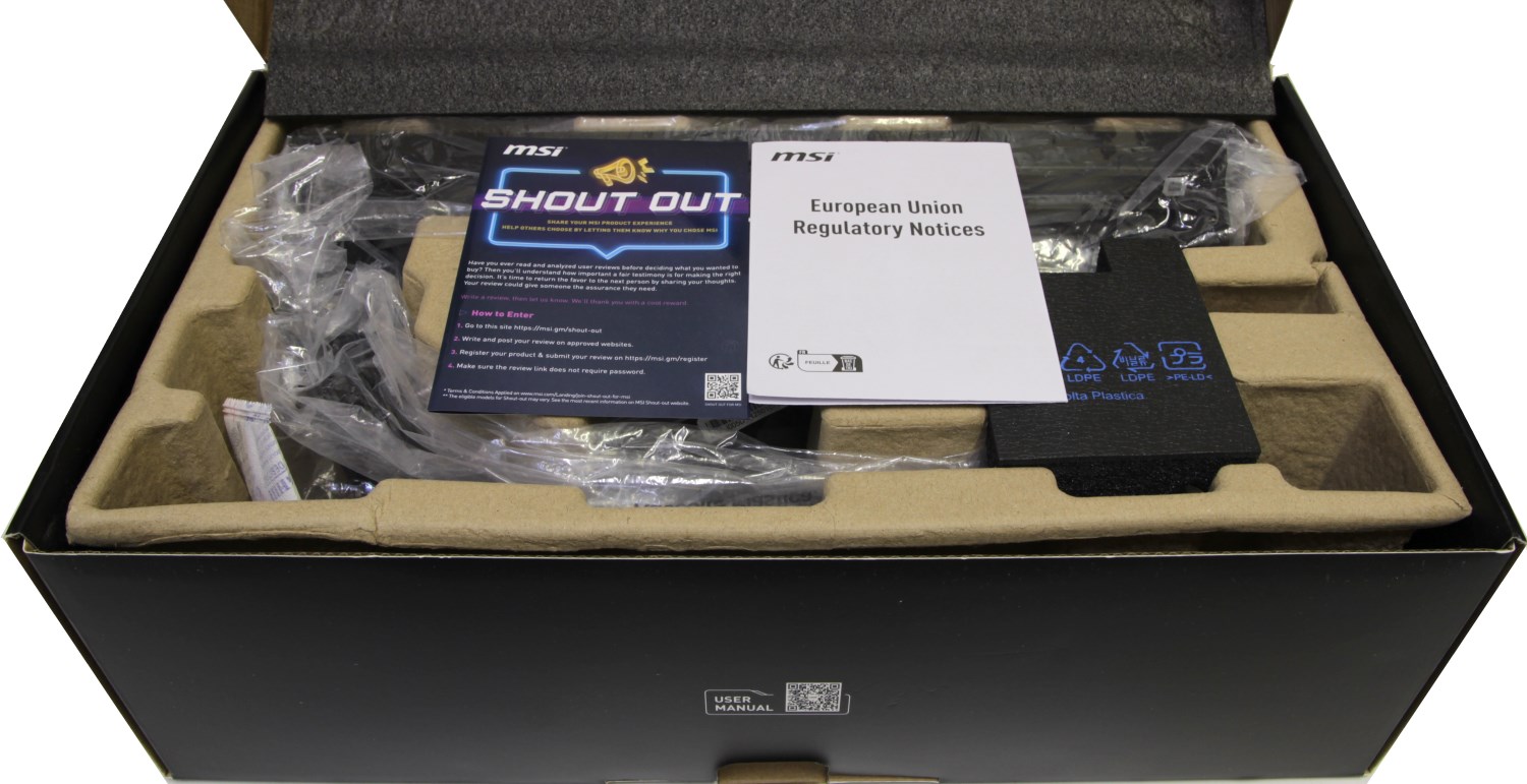 По центру есть ещё одна ниша, где в пакете лежит остальной комплект для установки системы. Он не очень большой потому, что она и так уже почти готова к установке. По сравнению с версией MSI MAG CoreLiquid A13 360 крепление отличается, соответственно комплект поставки другой.
