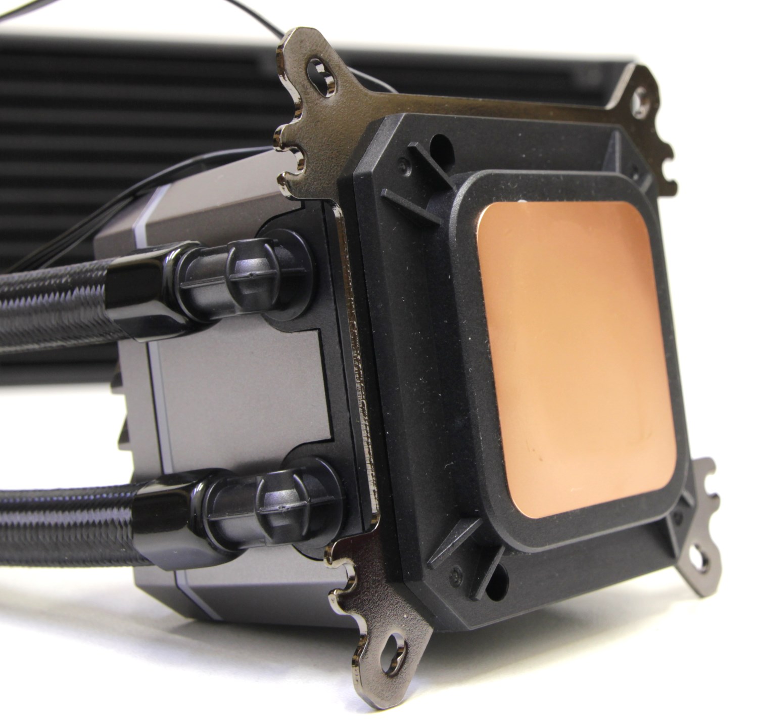 Вентиляторы по-прежнему соединяются друг с другом последовательно и для этого используются специальные коннекторы с последовательным подключением. Это позволяет существенно уменьшить количество кабелей, которые торчат во все стороны и портят внешний вид. И есть ощущение, что сами шланги здесь более мягкие и лучше гнутся, а вот штуцеры в основании, наоборот, поворачиваются туго. Ещё тут достаточно аккуратно сделано основание водоблока. На медной контактной площадке не заметно винтов крепления, а есть аккуратная рамка, в которой уже заметны углубления под крепёжные винты.