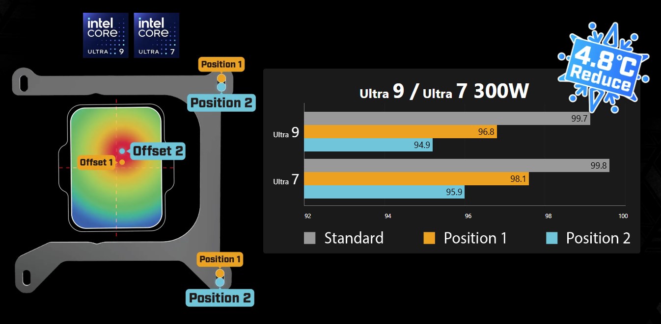 Меня в первую очередь интересовало отличие этой системы от похожей модели MSI MAG CoreLiquid A13 360. Они не так очевидны и не бросаются в глаза. По спецификации сразу стало понятно, что используется другая помпа. Трудно сказать, как она влияет на эффективность, но ресурс у неё заявлен вдвое выше. Также здесь предусмотрен режим смещения (офсет). Это необходимо для платформы Intel LGA 1851 из-за «плиточной» компоновки процессора. Эпицентр нагрева смещён относительно центра, поэтому производители СО предлагают подобный выход из этой ситуации со смещением основания. Тесты показывают, что благодаря этому можно отыграть несколько градусов, которые в определённой ситуации могут оказаться очень важными.