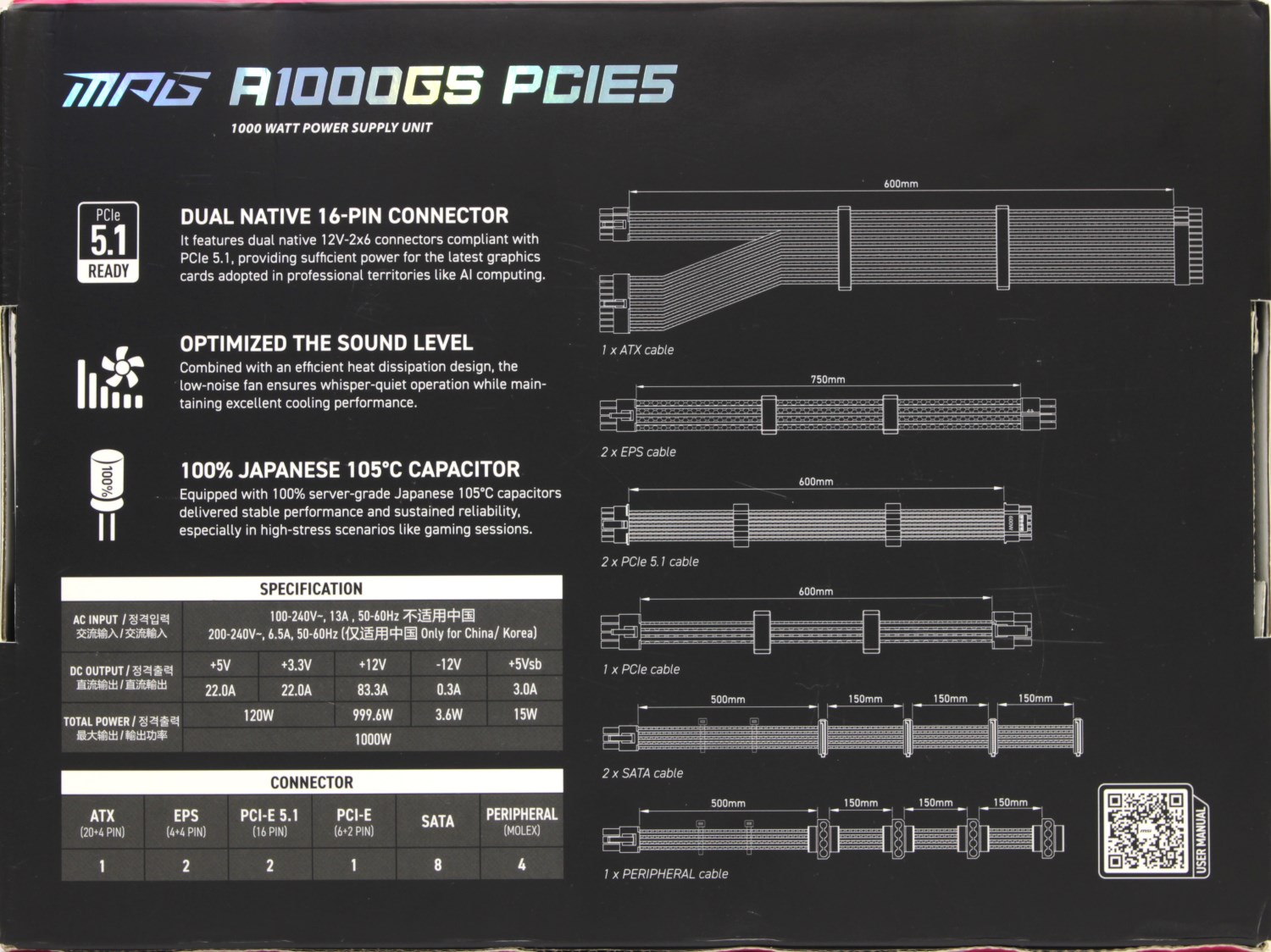 С обратной стороны информации больше. Здесь есть изображение кабелей с отмеченной длиной, таблица с количеством разъёмов и спецификация. Всё это также можно найти на сайте производителя. Кроме этого, продублирована информация о том, что блок соответствует ATX 3.1 и поддерживает разъём 12VHPWR в модификации 12V-2х6.