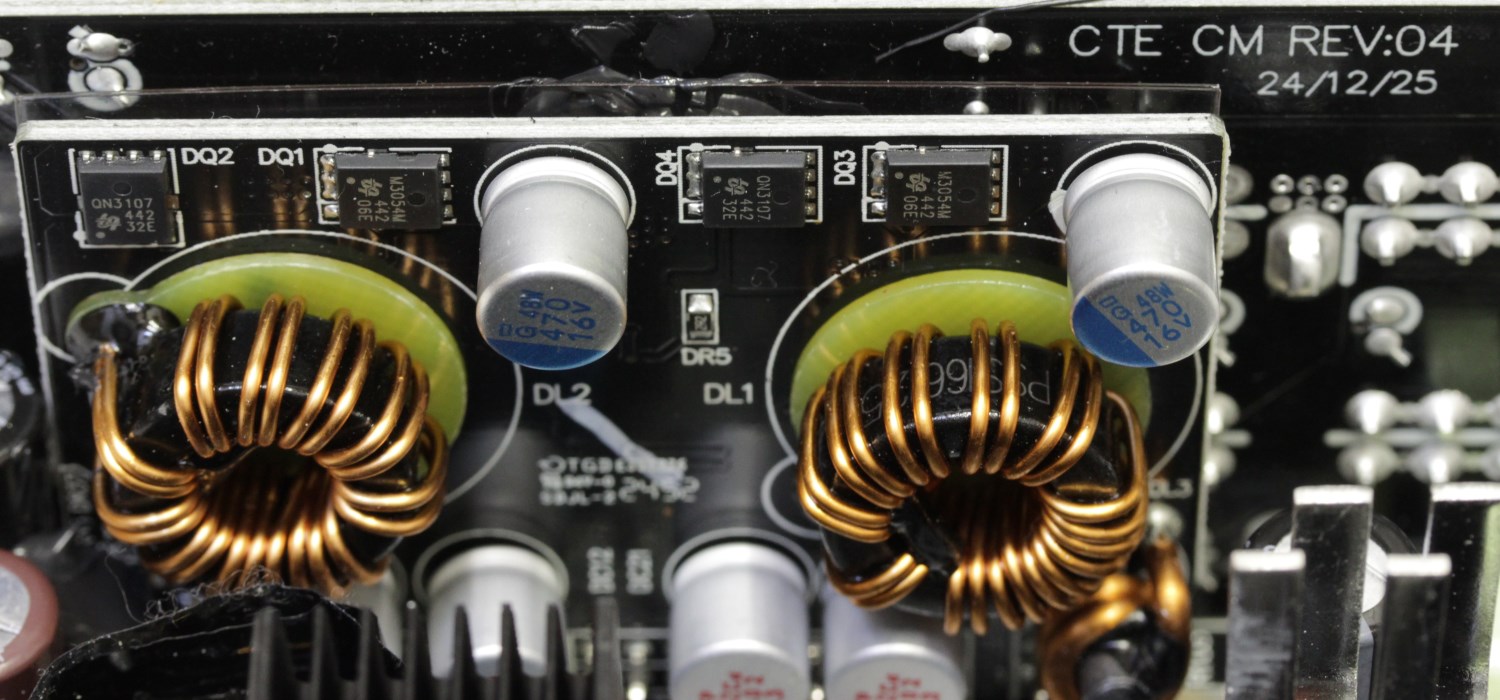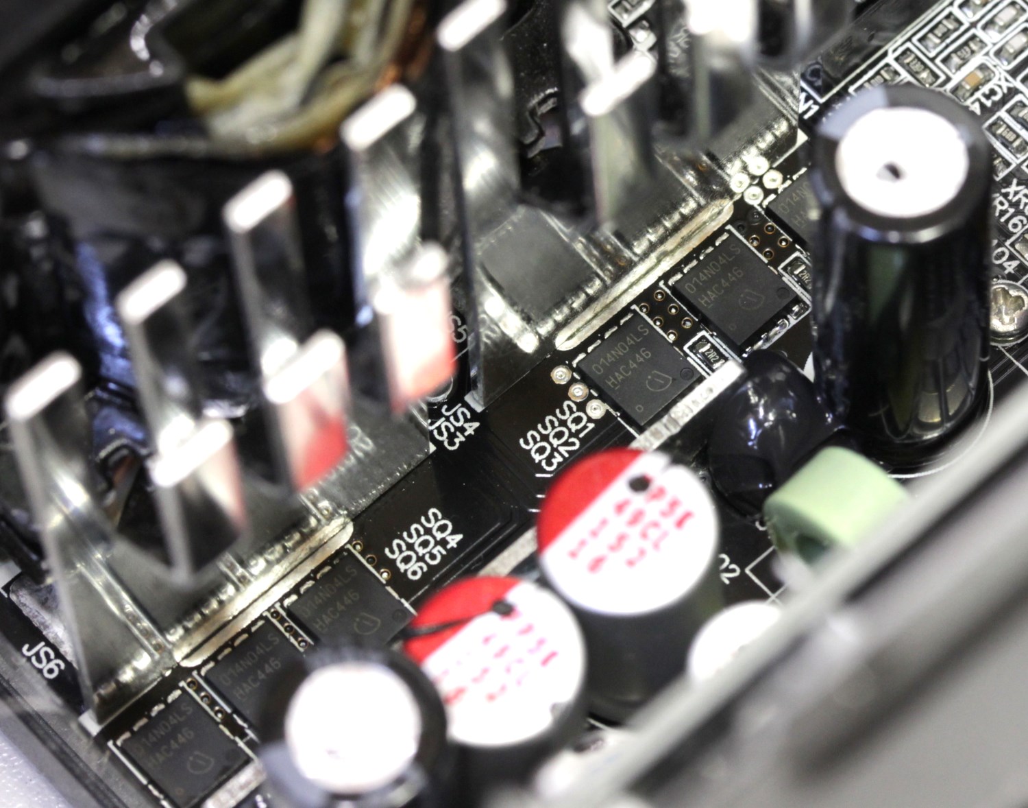 Компоновка внутри немного свободнее, чем в прошлом поколении. Это заметно даже по 12 В линии, транзисторы которой распаяны непосредственно на печатной плате, а не на вертикальной дочерней. Топология тут полуцифровая.