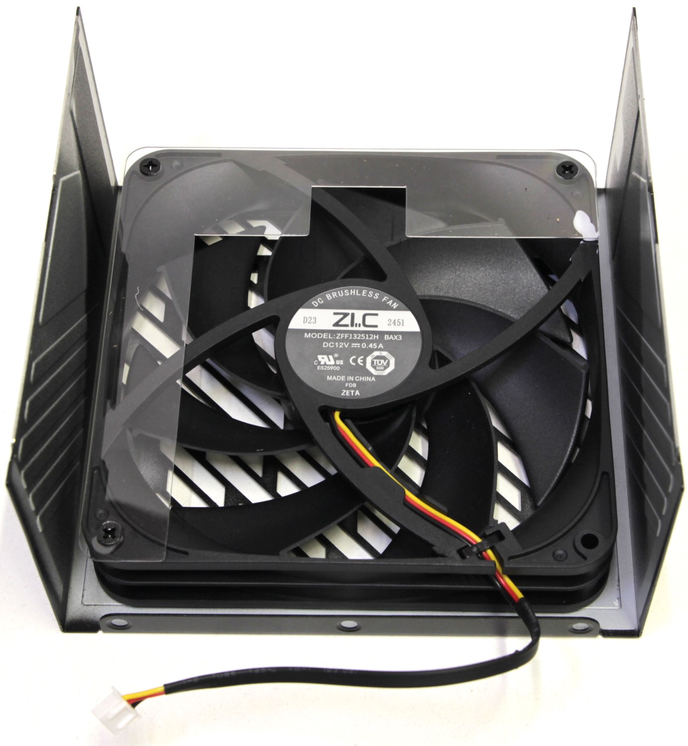 Вентилятор размера 135 х 135 мм производства компании Zeta модель ZFF132512H. Он оборудован гидродинамическим подшипником, максимальная скорость составляет 2300 об/мин, но на практике он её не достигает. Сам блок работает достаточно тихо, а ещё у него предусмотрен гибридный режим, когда при нагрузке до 40% вентилятор не работает.