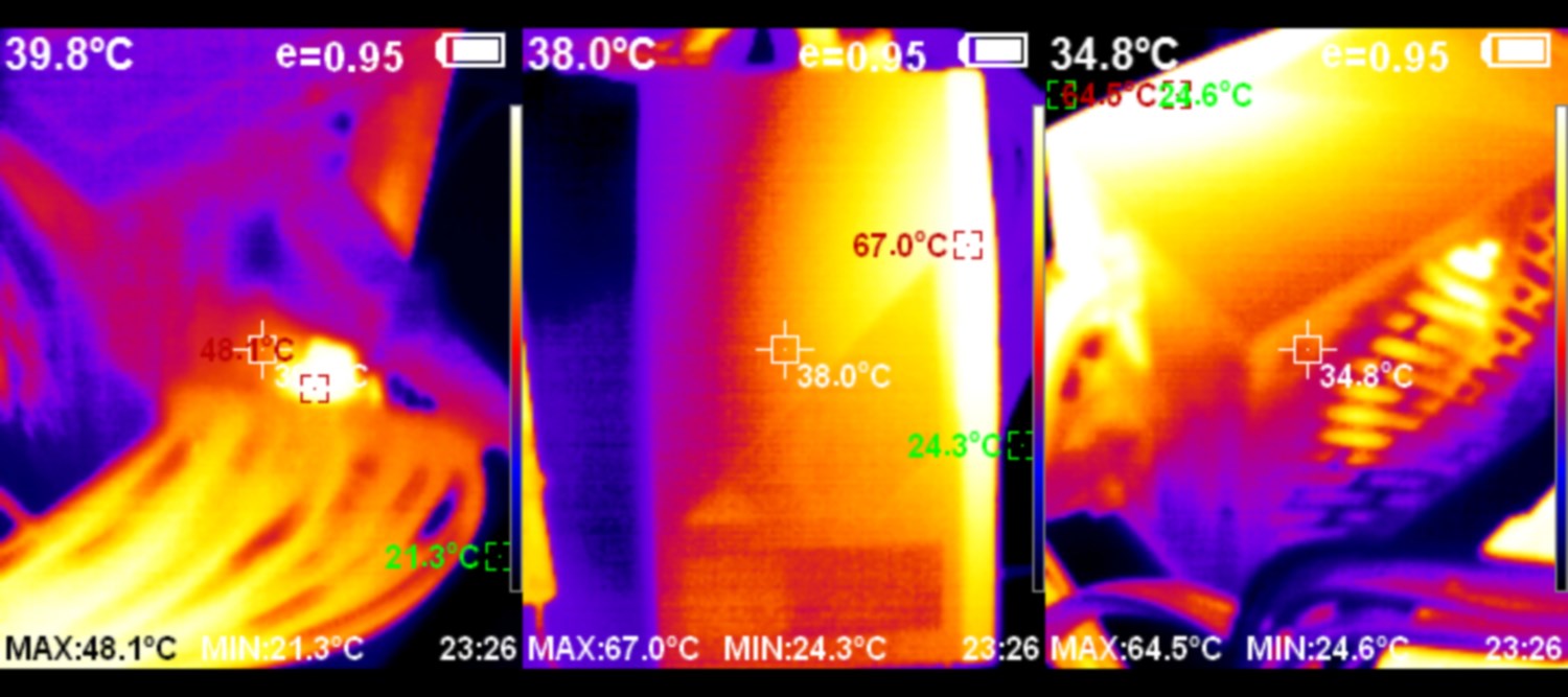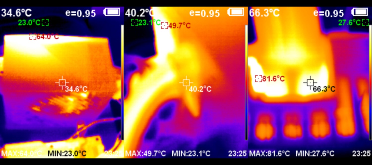 Тепловизор показывает, что при нагрузке блок питания греется не так сильно. Заметно сильнее он нагревается в пограничном режиме, когда вентилятор ещё не работает, а потребляемая мощность уже около 400 Вт.