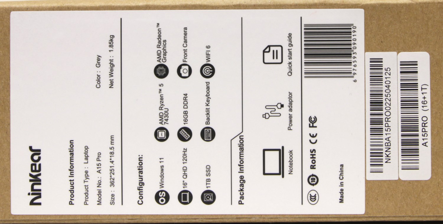 Ещё с одного торца есть наклейка, где перечислены основные характеристики устройства. Указана модель процессора, объём памяти, формат матрицы, габариты и вес.