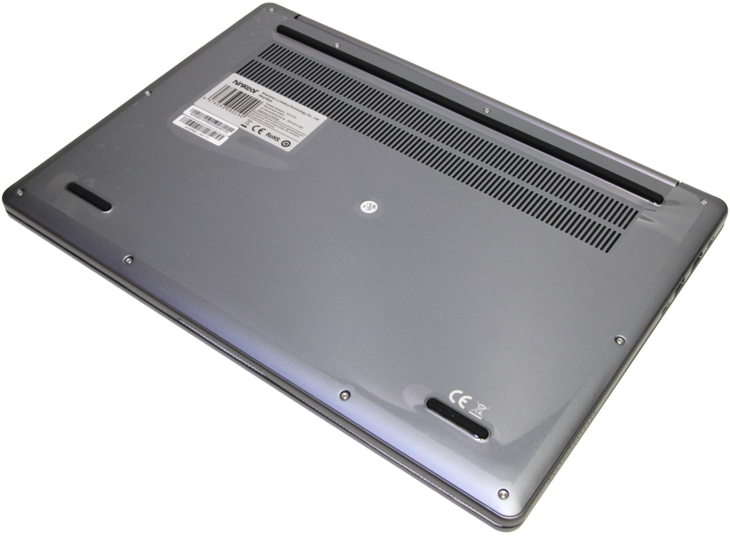 Снаружи на нём находятся две небольшие и одна длинная резиновые ножки и информационная наклейка. Стоит ноутбук на ровной поверхности очень устойчиво.