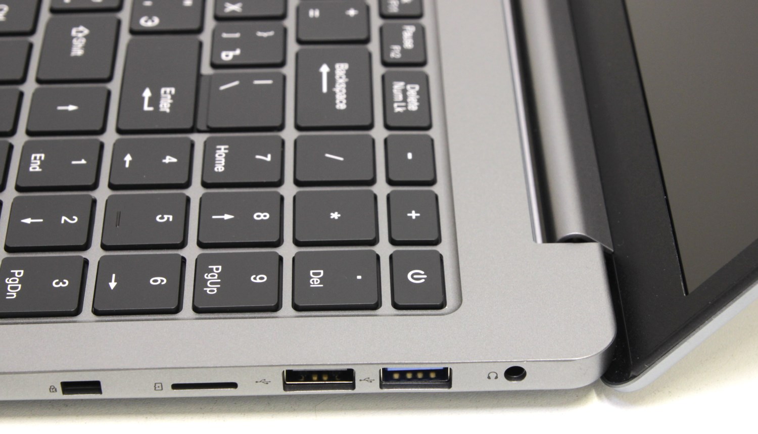 С правой стороны есть слот для карт памяти MicroSD, USB 3.0 Type-А, разъём 3.5 мм для гарнитуры, USB 2.0 и отверстие для замка Кенсингтона.