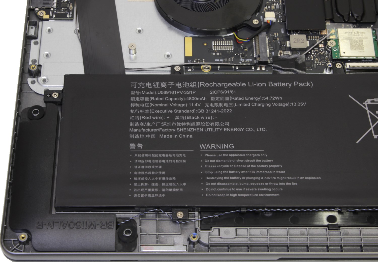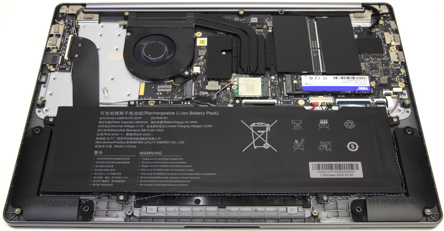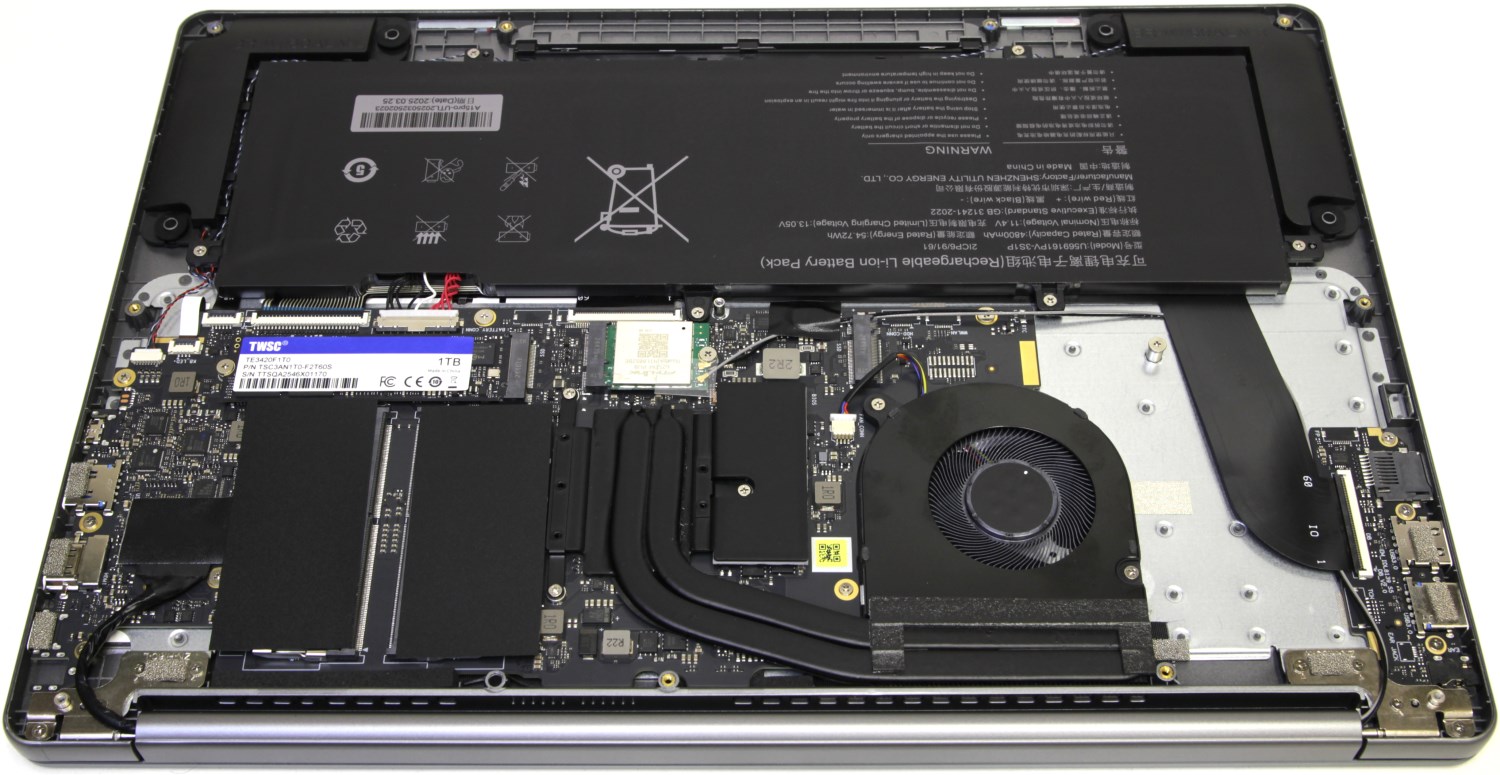 Ноутбук не совсем компактный, поэтому компоновку внутри нельзя назвать плотной. Свободного места тут хватает. Много места занимает аккумулятор, но в данном случае он не очень ёмкий. Материнская плата и система охлаждения тоже достаточно компактные. В основном это обусловлено скромным TDP процессора, который он старается не превышать под нагрузкой.