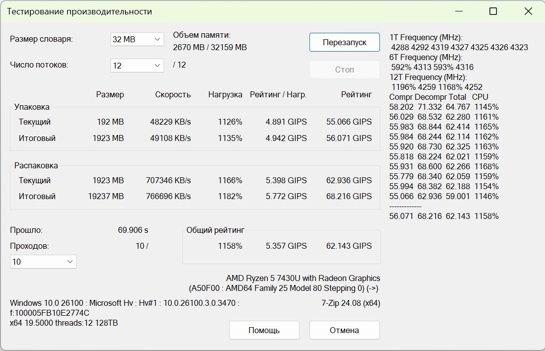 Характеристики вполне соответствуют ценовому сегменту. Аккумулятор не очень ёмкий, габариты и вес тоже не очень скромные. Что касается платформы, то процессор AMD Ryzen 5 7430U – это аналог AMD Ryzen 5 5600G, но менее производительный за счёт скромного теплопакета в 15 Вт. Это говорит о том, что перед нами архитектура AMD Zen3, 6 ядер и 12 потоков, интегрированная графика с семью вычислительными блоками. Поэтому если честно, то к 7000-серии этот процессор никак не относится. Также могут попадаться упоминания о том, что это якобы игровой ноутбук. В моём понимании под эту формулировку может попадать устройство с дискретной графикой и то не любой, а тут интегрированное видео, причём далеко не самое современное и производительное.