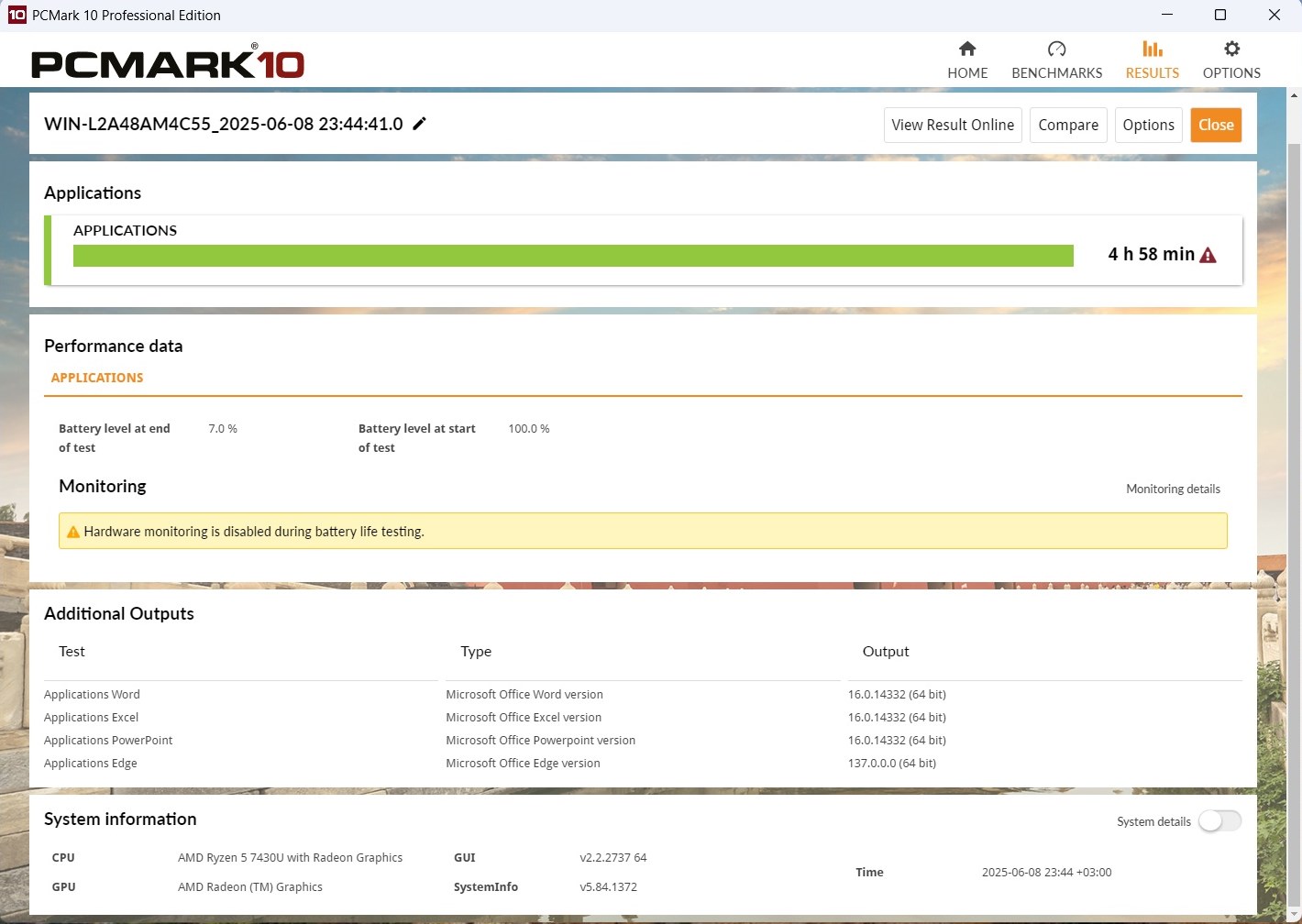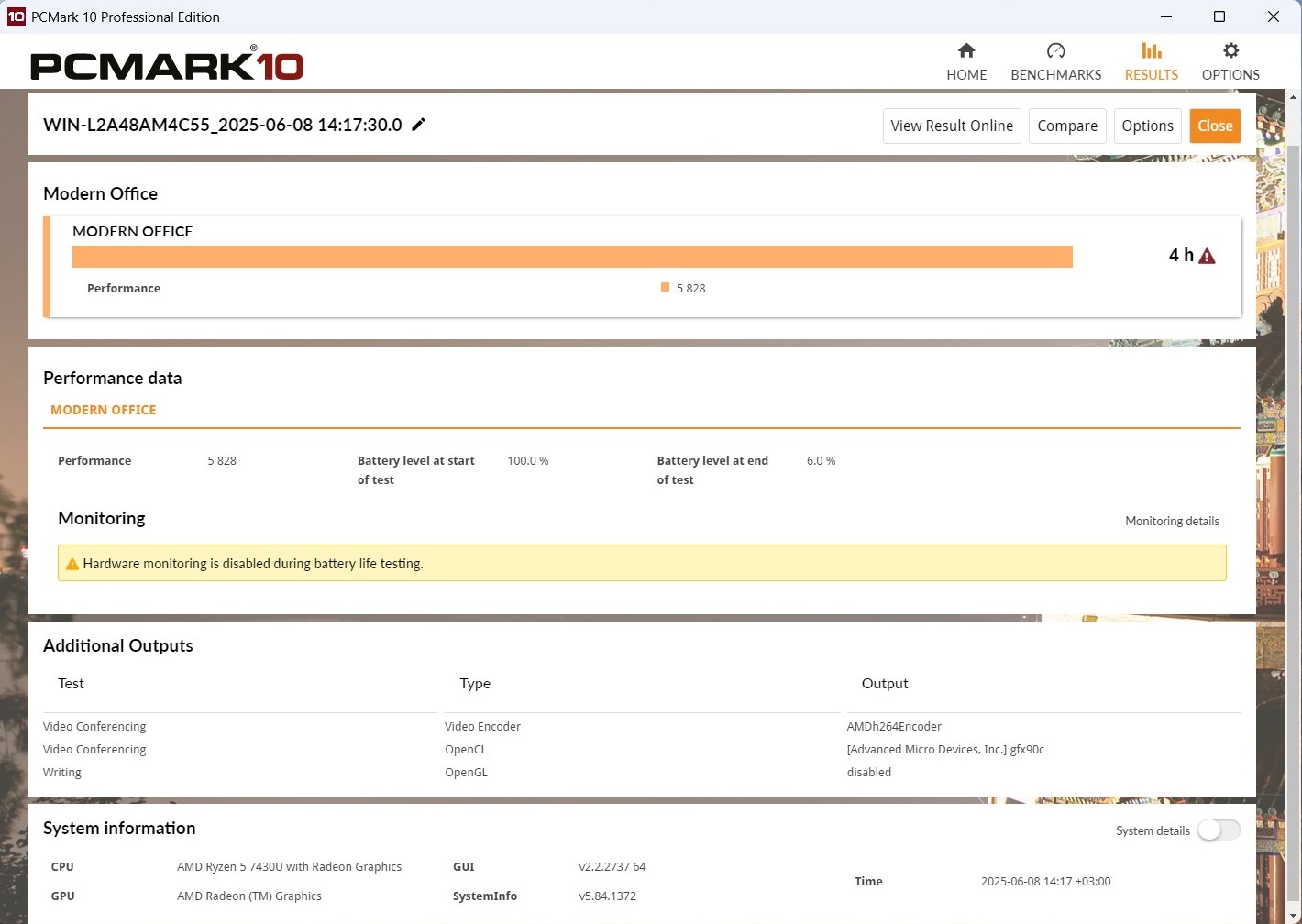 Работать в офисных задачах от аккумулятора можно достаточно долго. Производитель заявляет время работы до 7 часов в экономичном режиме. Тестовый пакет PCMark с предустановкой Modern Office работает 4 часа, но это в обычном режиме.