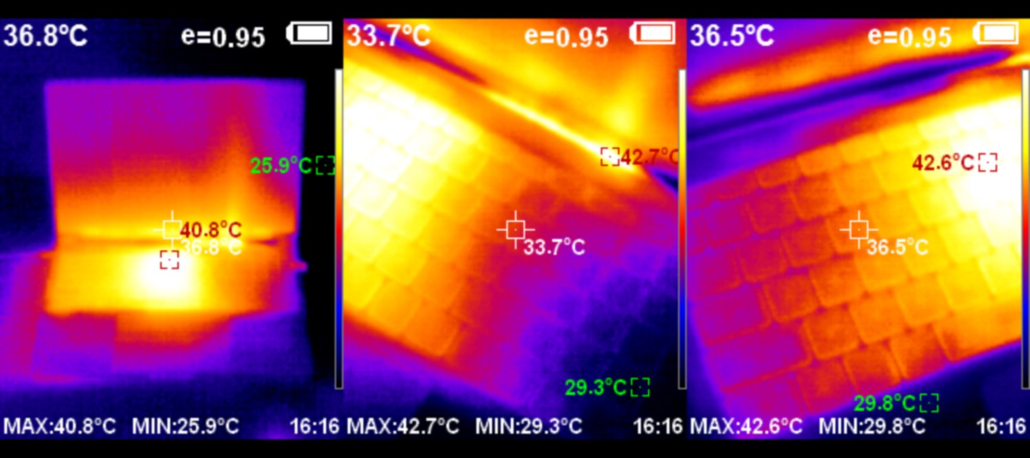 Нагрев устройства достаточно умеренный. Даже при использовании тяжёлых приложений (Prime95 и Furmark) температура клавиатуры не поднимается выше 43°C.