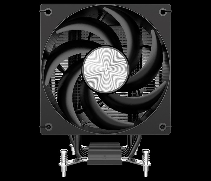 Спереди находится изображение самого кулера, и мы видим, что это классическая односекционная «башня» с одним вентилятором. Подсветки не предусмотрено. Из всех украшений сверху можно заметить пластиковую крышку с логотипом и серебристый диск в центре пропеллера вентилятора.