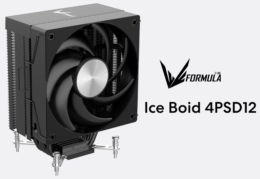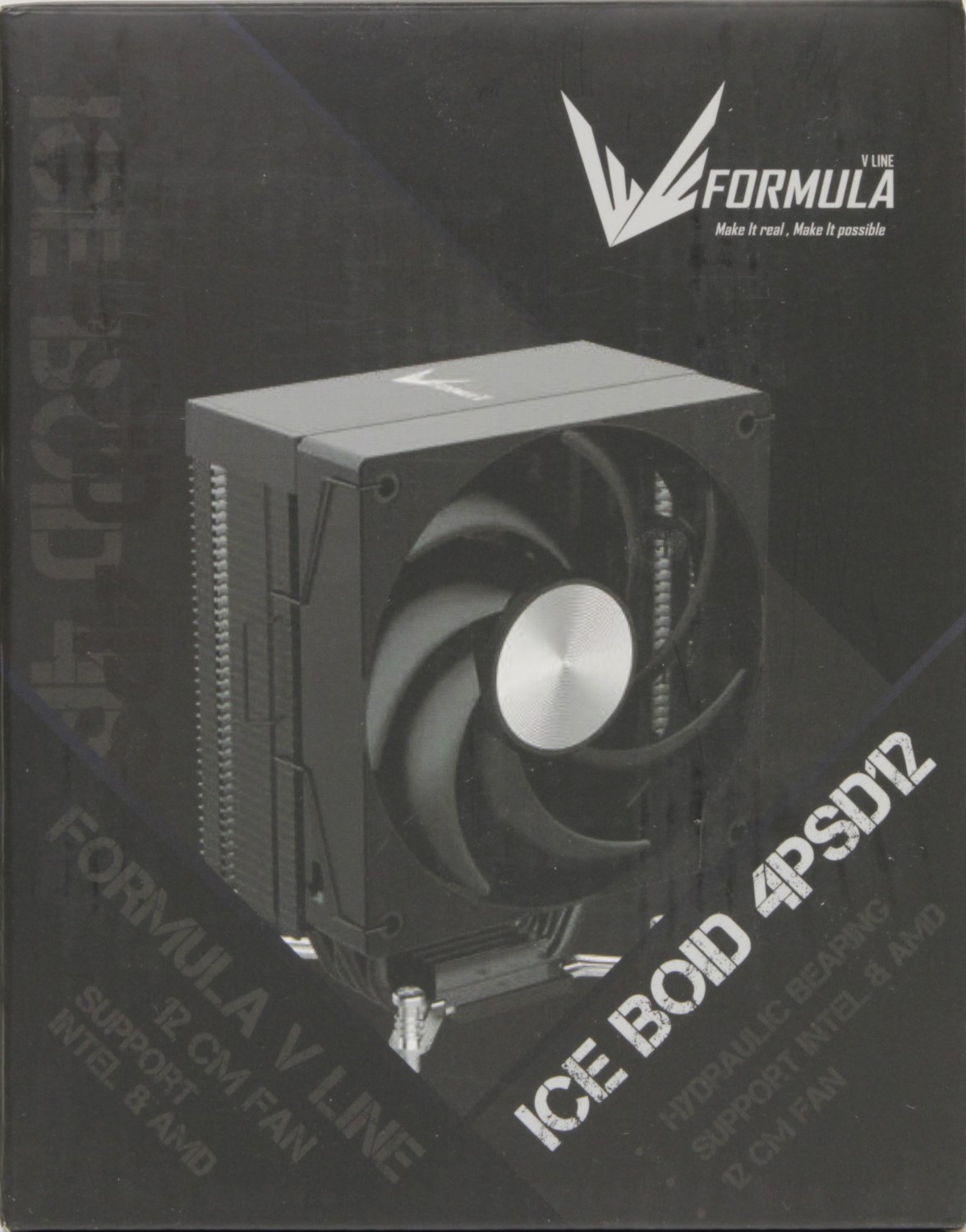 Именно на такую модель я случайно натолкнулся. Называется она Formula V Line Ice Boid 4PSD12. Название не самое простое и запоминающееся, но мне понравилась цена новинки, и я решил взять пару таких кулеров для обычных офисных сборок, а заодно проверить эффективность охлаждения.