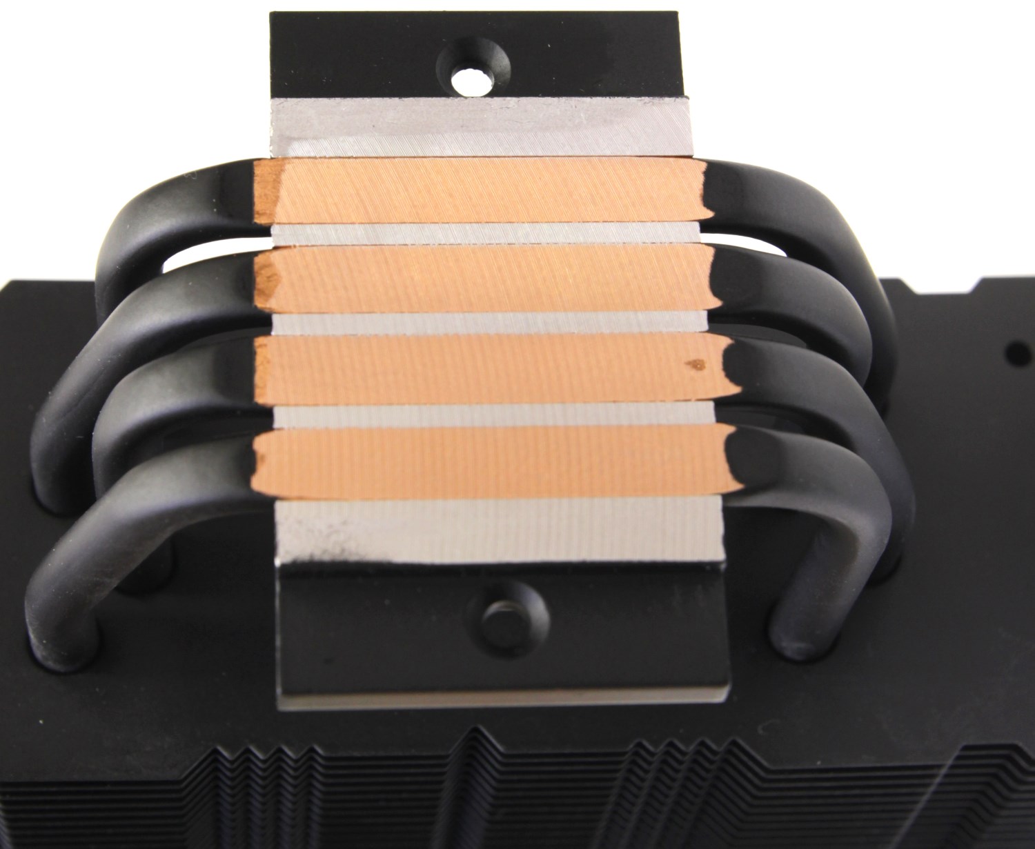 Конструкция радиатора знакома. Из алюминиевого основания расходятся четыре медных тепловых трубки диаметром 6 мм. Следов пайки или клея не видно. Но алюминиевая часть основания прочно взаимодействует с этими трубками. Возможно, здесь используется альтернативный метод фиксации трубок, например, путём расширения и сжатия. Теплосъёмника нет, есть прямой контакт тепловых трубок с верхней крышкой процессора.