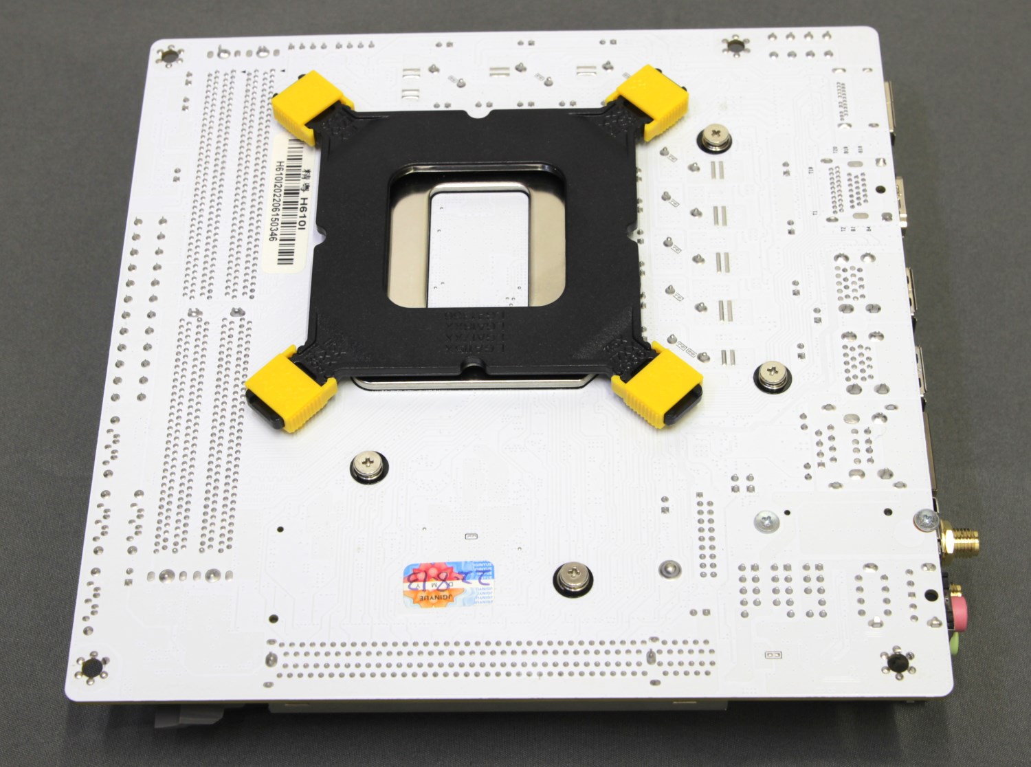 В комплекте есть универсальный бэкплейт для платформ Intel с регулируемыми наконечниками под разные расстояния между отверстиями. Для платформ AMD используется их штатная задняя пластина. Каждая прижимная пластина оборудована двумя винтами на пружинах. Отверстия сделаны вытянутой формы и поэтому их можно передвигать. Сделано это для универсальности и лучшей совместимости.