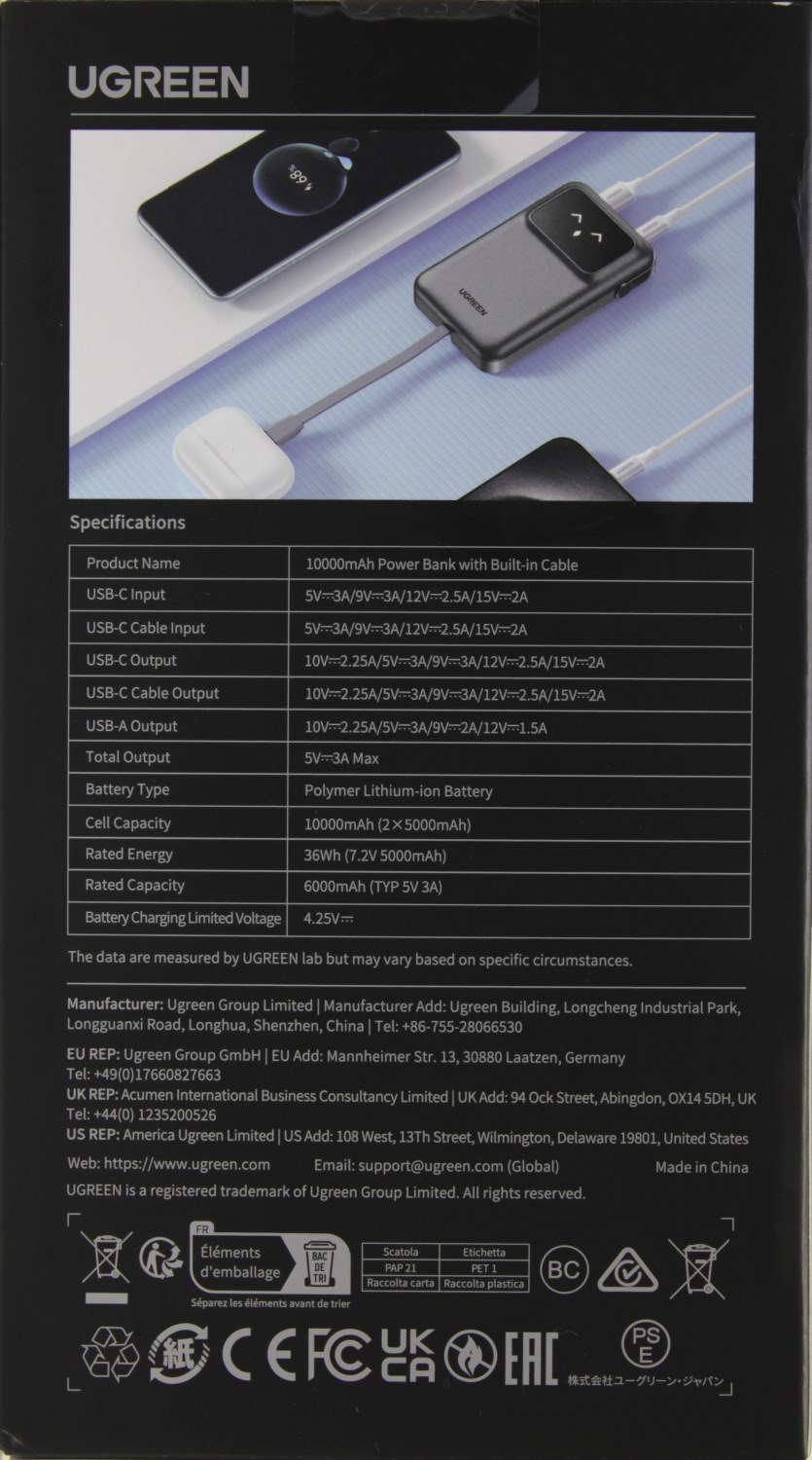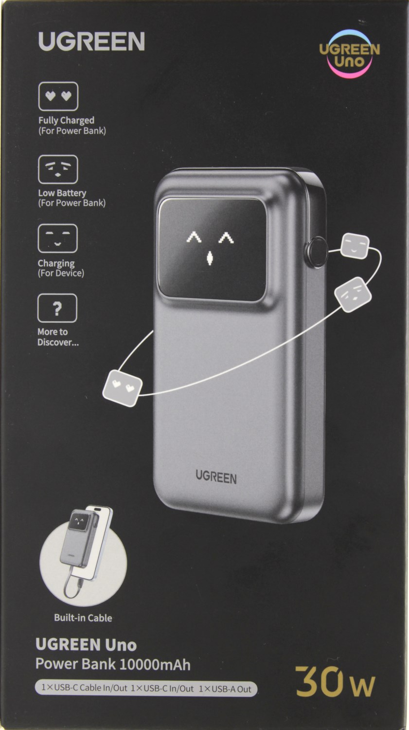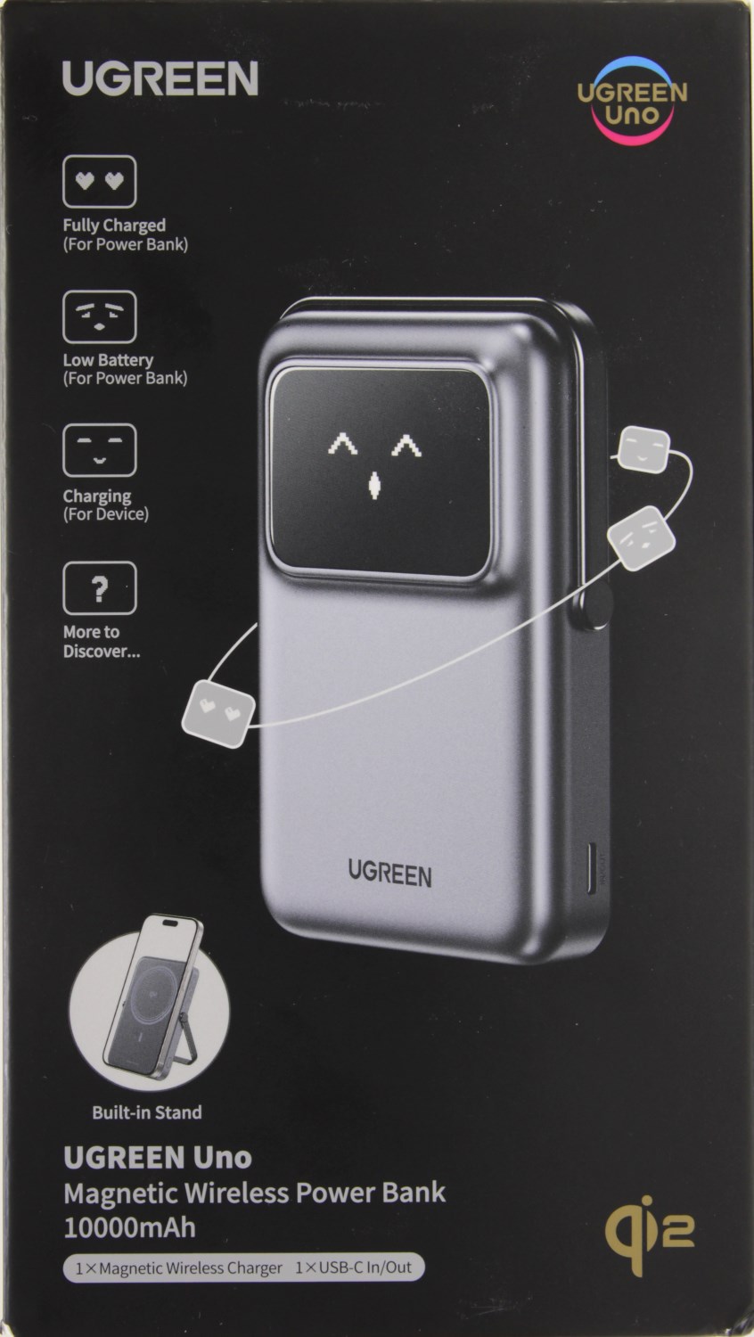 Сверху можно заметить логотип компании. Кстати, фон упаковки преимущественно чёрный. В левой части находится столбец с четырьмя пунктами, которые расшифровывают эмодзи, отображающиеся на экране. Снизу указана модель Ugreen Uno, также уточняется, что это магнитный беспроводной пауэрбанк.