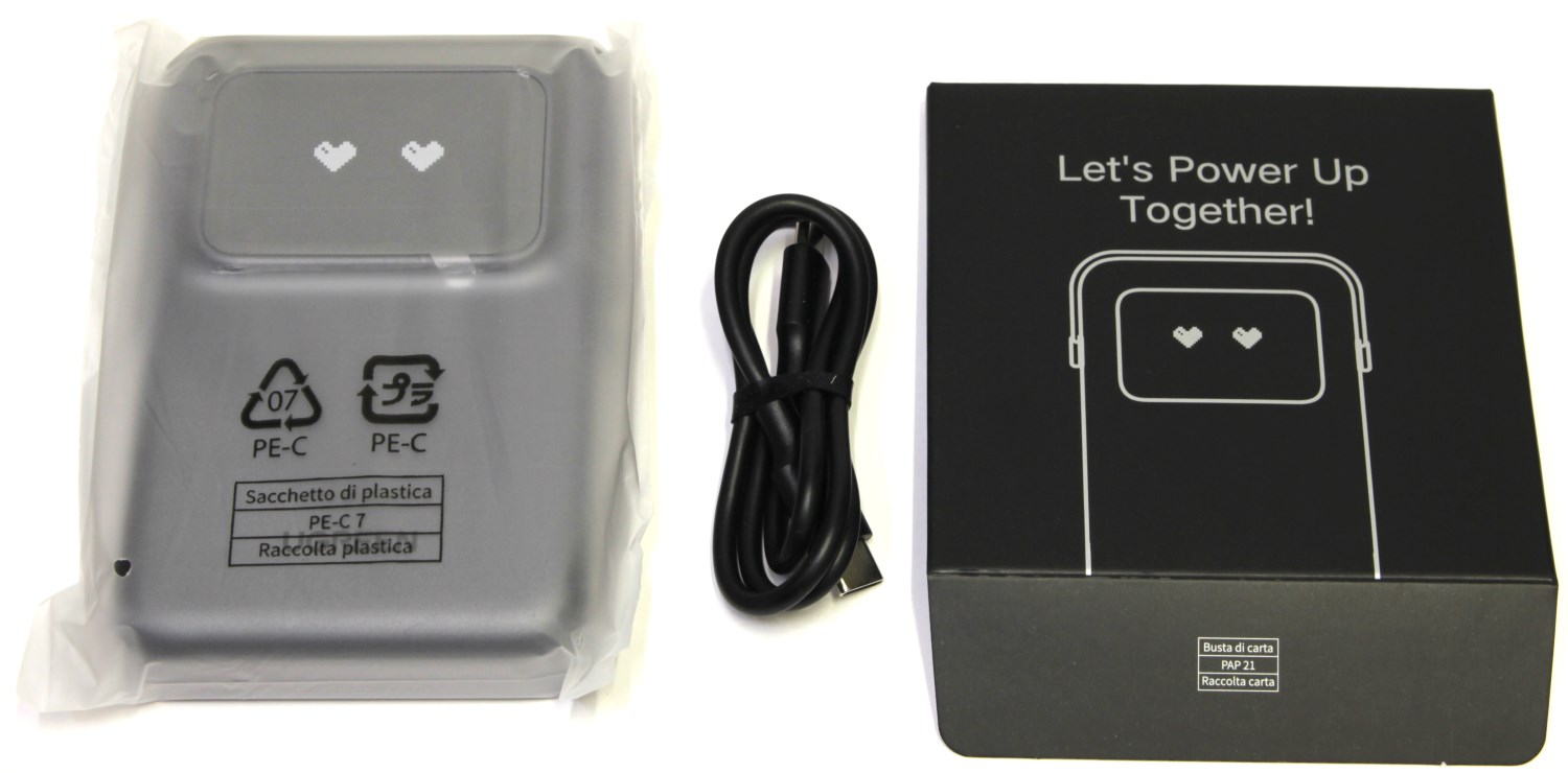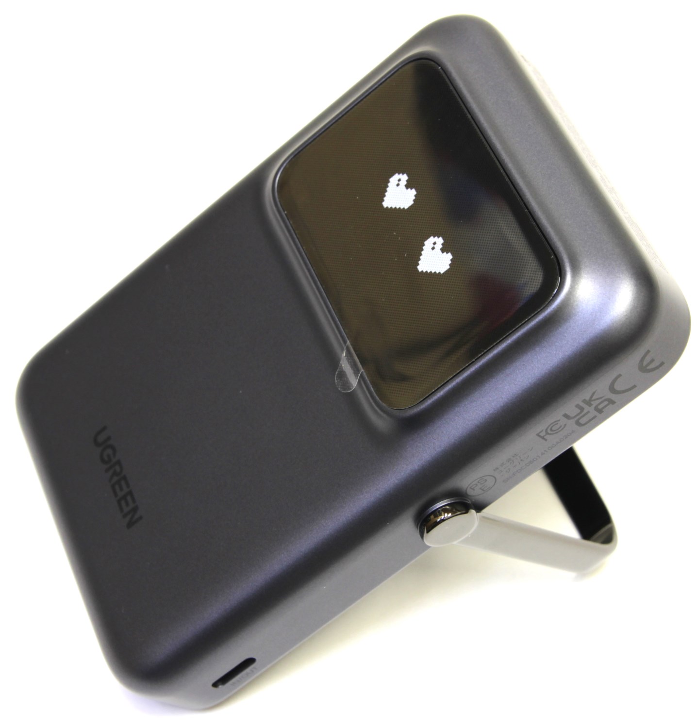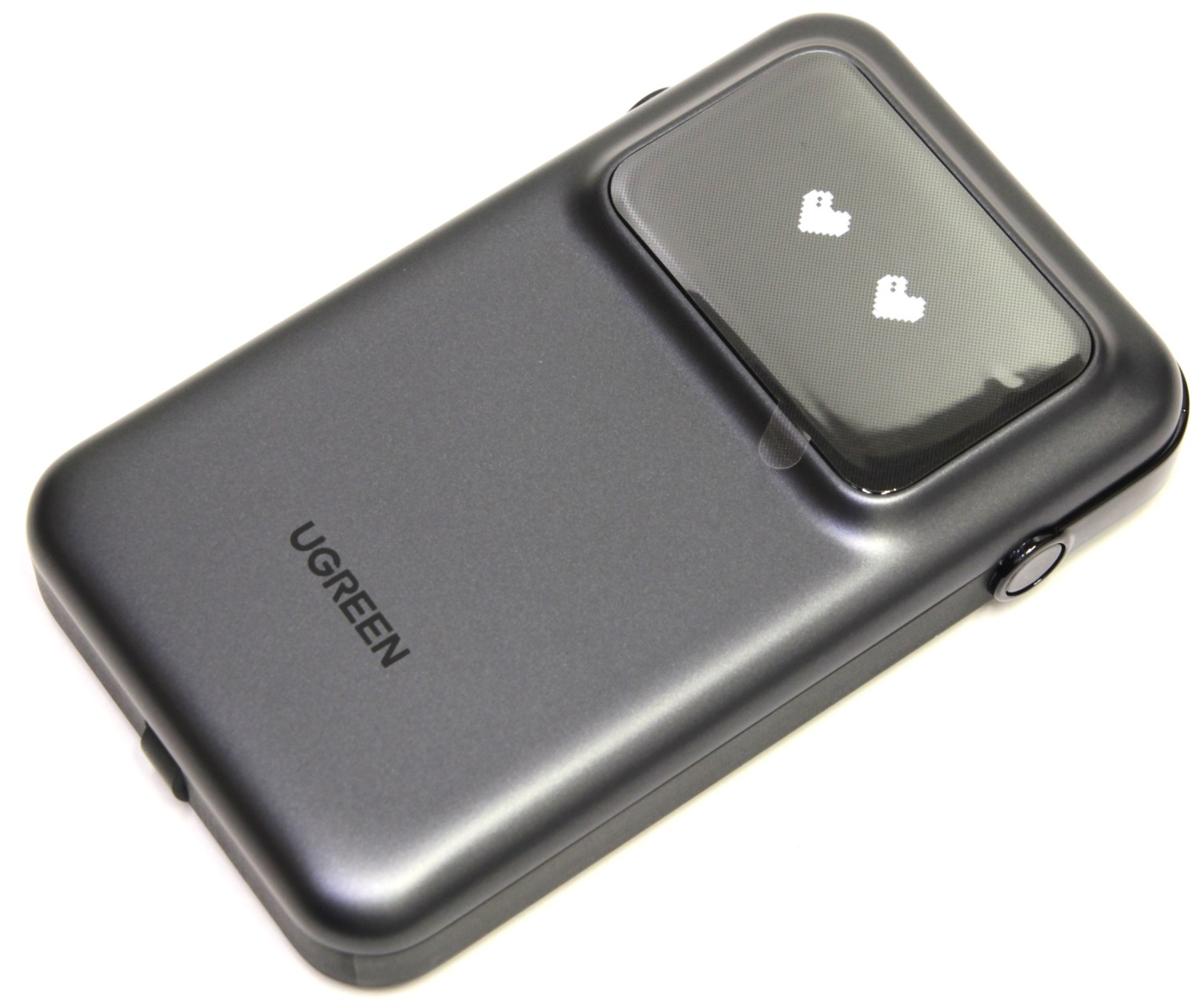 Устройство представляет собой небольшой пластиковый кирпич, с выпуклым экраном. Это решение достаточно спорное, и я бы сделал его вровень с остальным корпусом, чтобы он меньше мешался и царапался. На него выводятся различные эмодзи, которые отражают уровень заряда. Также эта информация дублируется цифрами в процентном отношении.