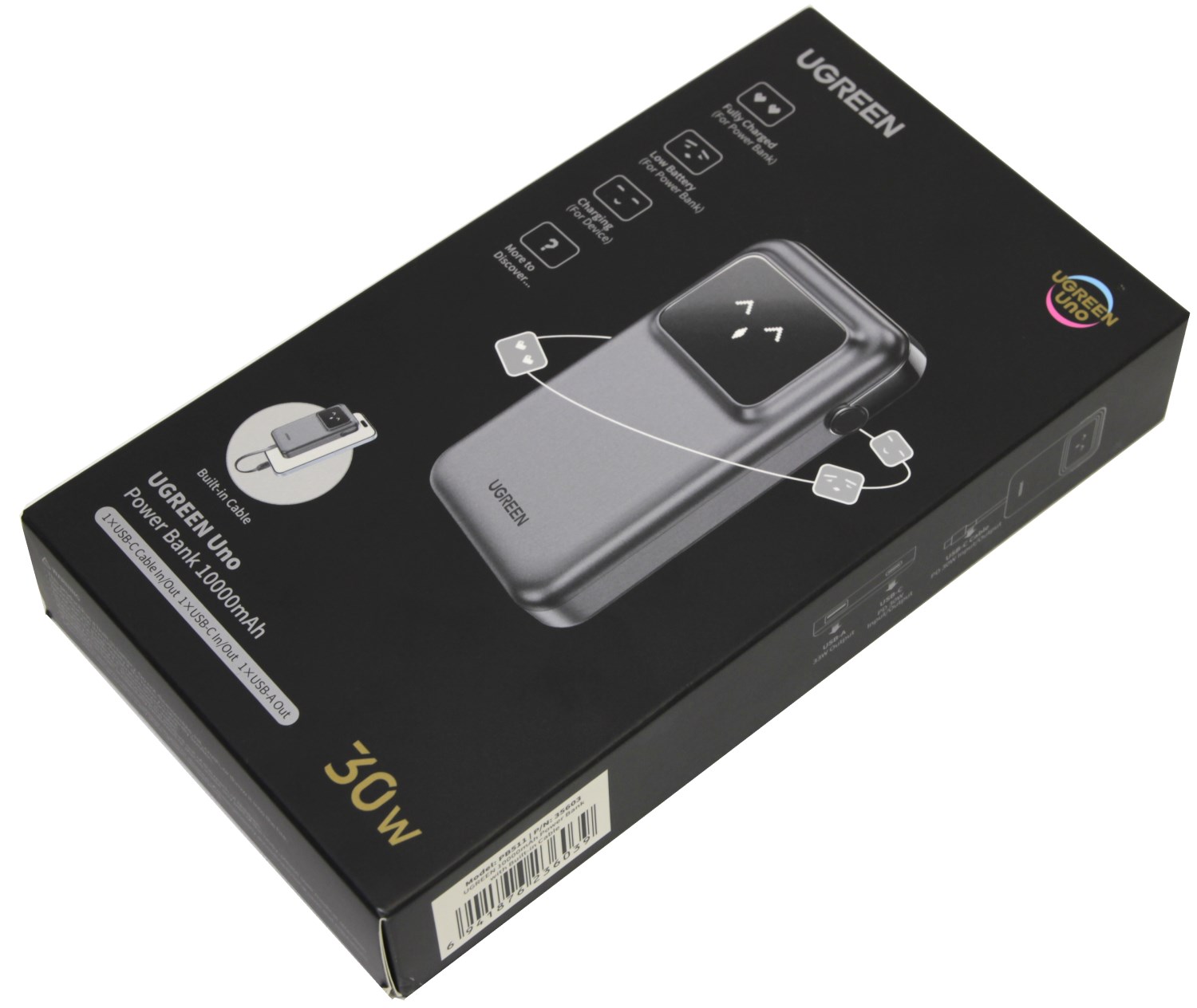 Сверху также находится логотип компании. Фон упаковки преимущественно чёрный. В левой части есть такой же столбец с четырьмя эмодзи. Там же приводится расшифровка всех этих состояний. Кроме этого, на экране отображается непосредственно уровень заряда самого устройства в процентах. Здесь уже снизу просто указано, что это пауэрбанк с ёмкостью 10 000 мАч. А в правом нижнем углу есть упоминание максимальной мощности зарядки – 30 Вт.