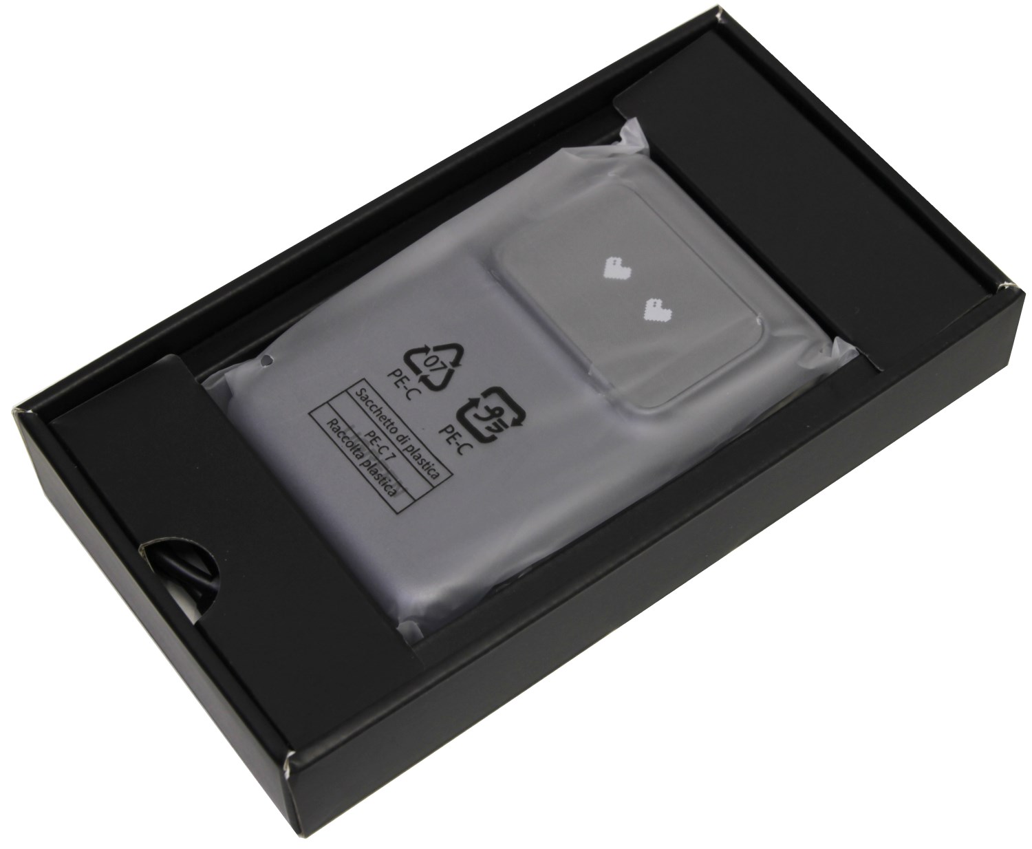 По центру находится само устройство, которое упаковано в белый полупрозрачный пакет. Снизу аккуратно упакован конверт, с инструкциями. Выше предусмотрен отсек, где спрятан короткий кабель USB Type-C – USB Type-C.