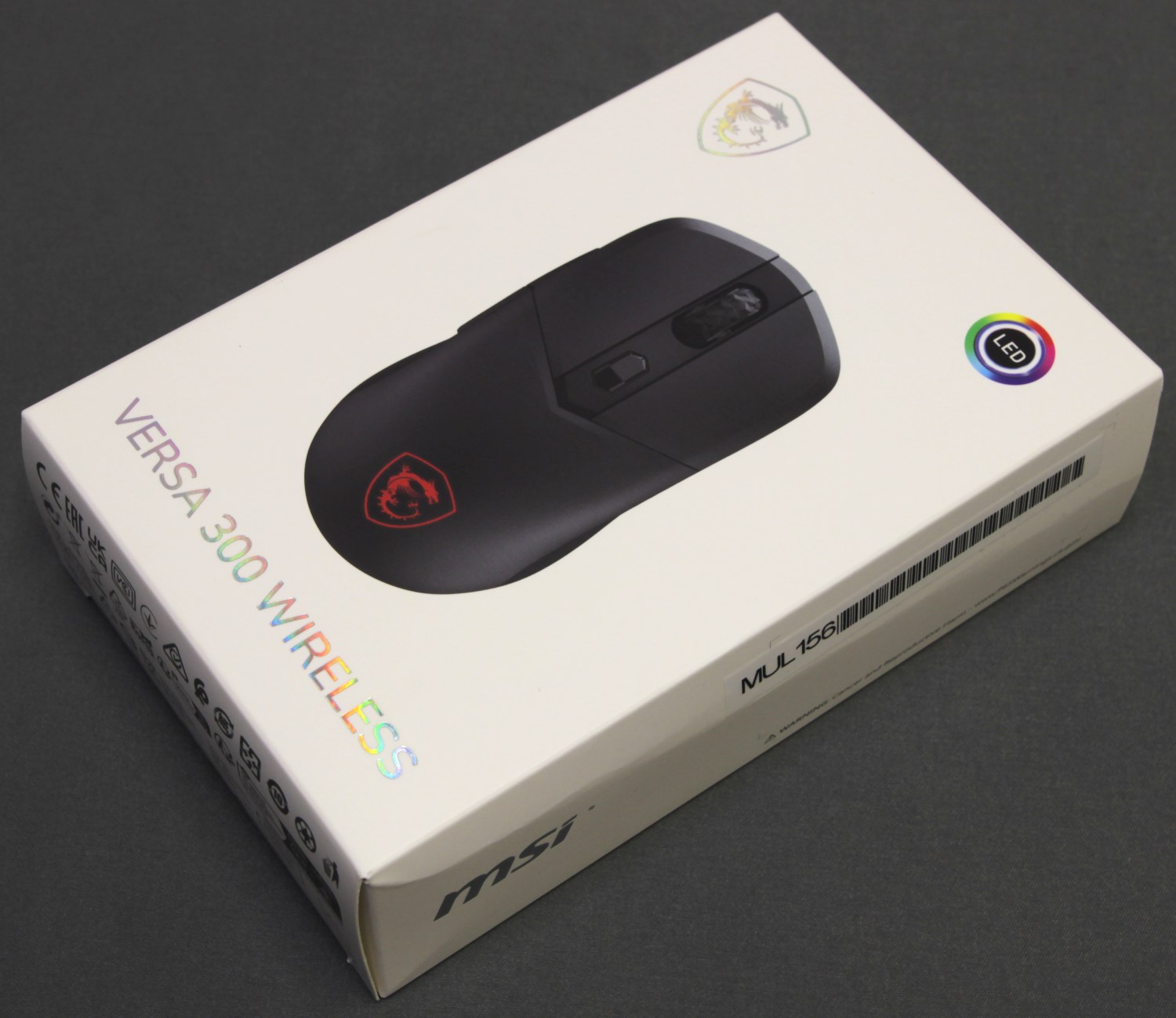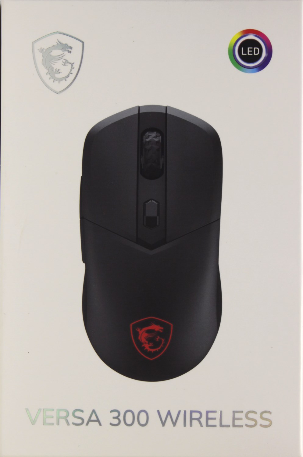 Спереди, в правом верхнем углу находится значок RGB LED. Логотип в левом углу и надпись снизу сделаны серебристыми, переливающимися на свету линиями. Ближе к центру есть крупное изображение устройства. Из названия следует, что мышка беспроводная, но спереди нигде не уточняется, по какой технологии осуществляется эта связь.