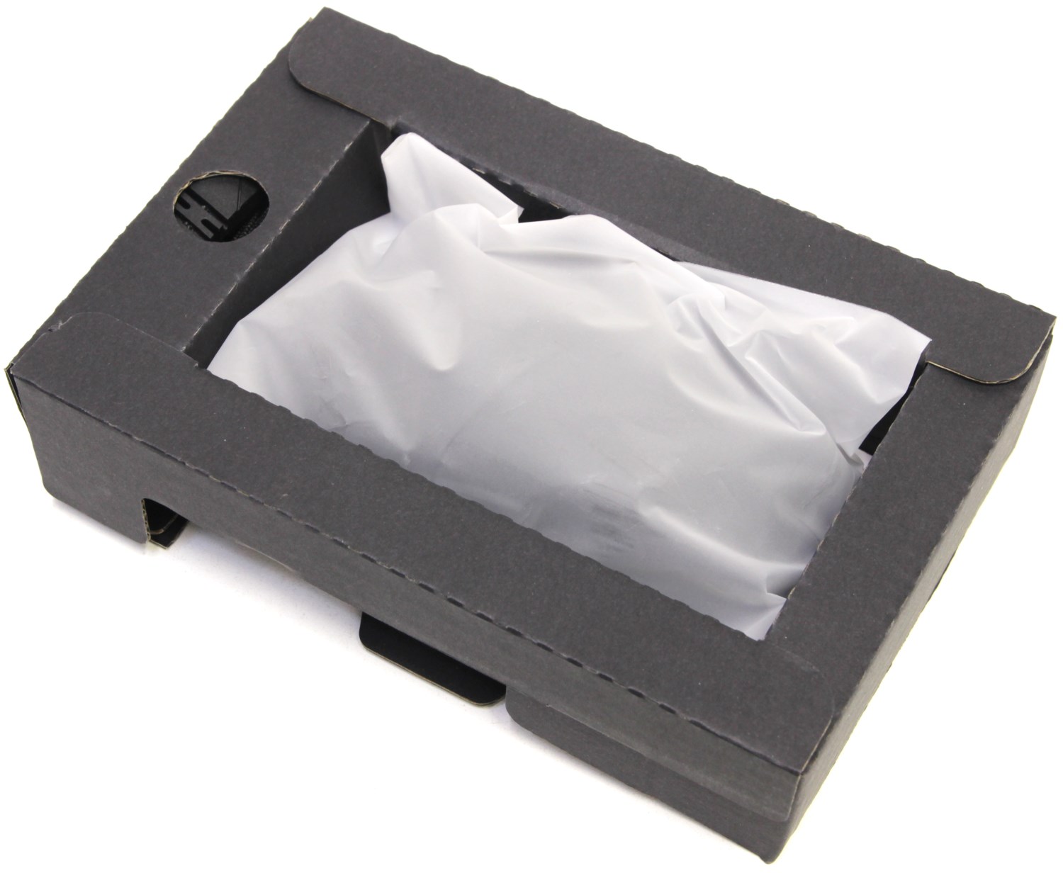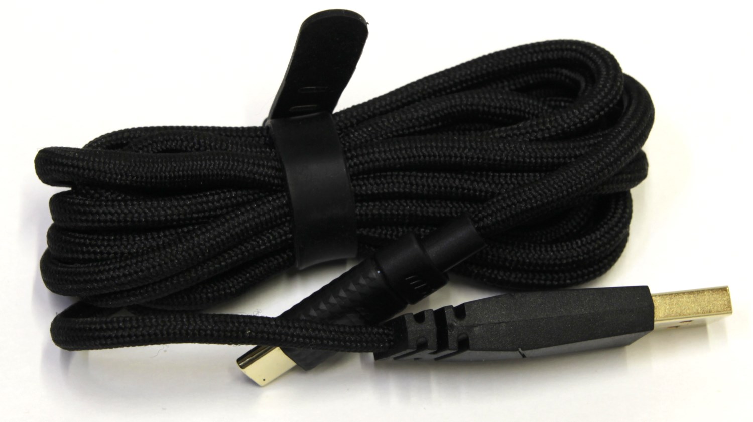 Здесь мы видим лоток из чёрного картона. В нём лежит мышка, которая дополнительно упакована в пакет. Под ней находится один буклет. А ещё отдельно лежит гибкий и мягкий кабель, чтобы можно было использовать мышь как проводную, а также подзаряжать аккумулятор.
