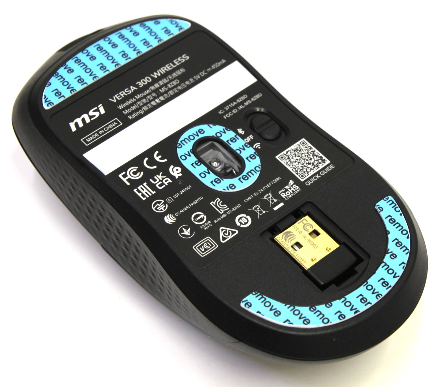 В качестве интерфейса используется USB 2.0, радиоканал частотой 2,4 ГГц или Bluetooth на выбор. На брюшке мыши посередине находится сенсор. Здесь он оптический Pixart 3104 (45 ips / 15 g / 4000 dpi), но в компании его каким-то чудом разогнали до 8000.