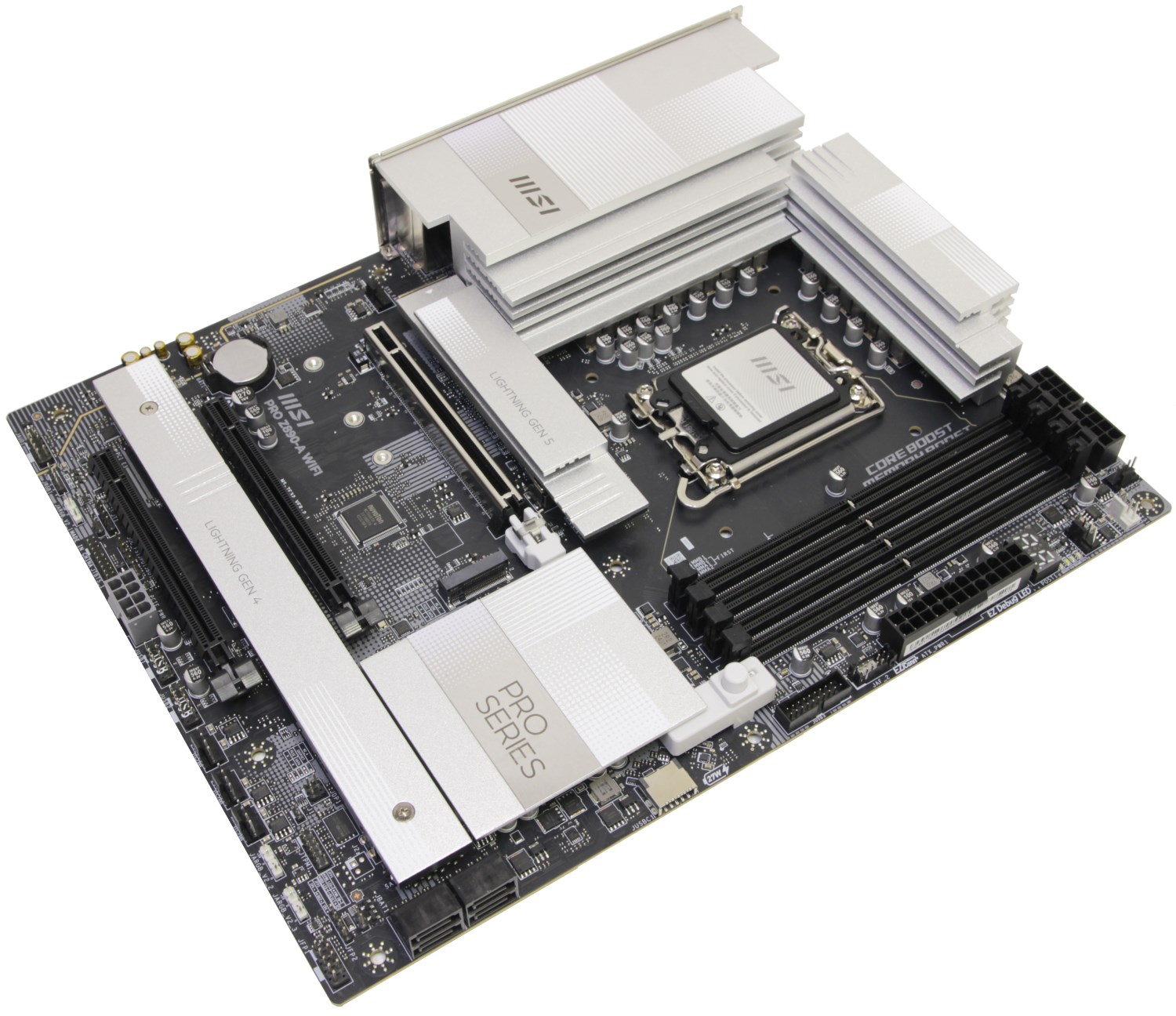 Перед нами материнская плата формата АТХ. Её габариты не отличаются от классических и составляют практически 305 х 244 мм. По дизайну плата сильно напоминает MSI MAG Z890 Tomahawk WIFI. Однако это касается самой печатной платы, а не оформления. Последнее здесь своё и соответствует серии PRO, где отличительной особенностью в этом поколении являются серебристые радиаторы.