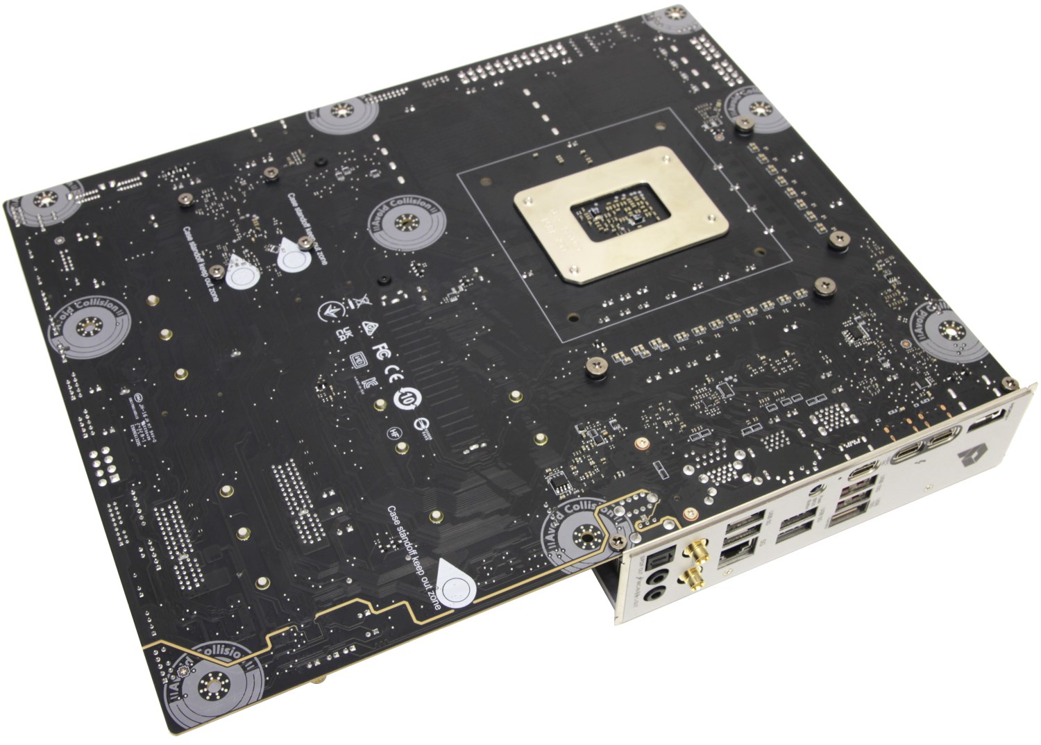 С обратной стороны платы элементов практически нет, но есть знакомые маркеры белого цвета, которые показывают места на плате, где могут располагаться втулки на корпусе. Производитель намекает, что неплохо бы их убрать. Светодиодов тут нет, ведь это не геймерская плата. Зато в наличии куча керамических конденсаторов.