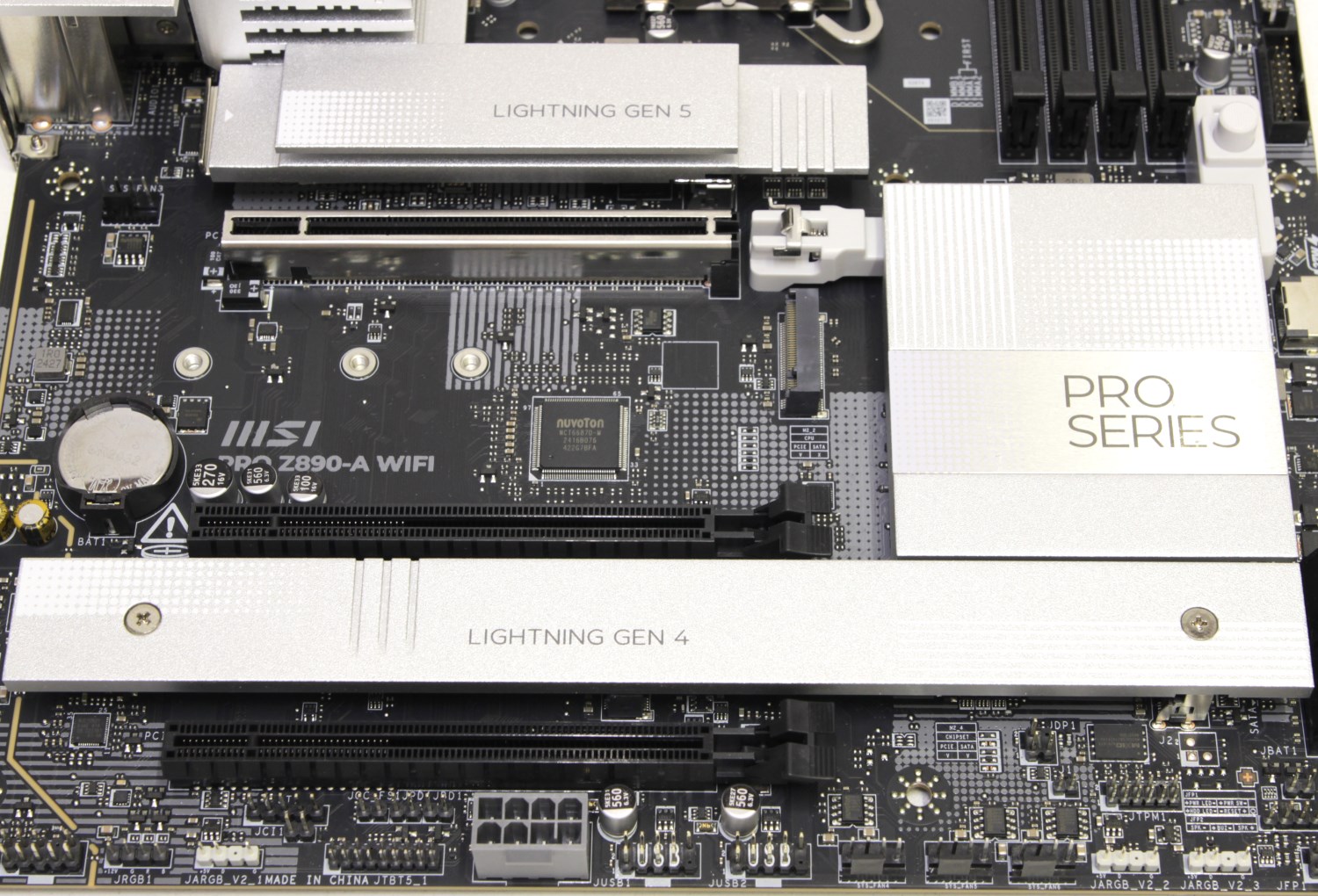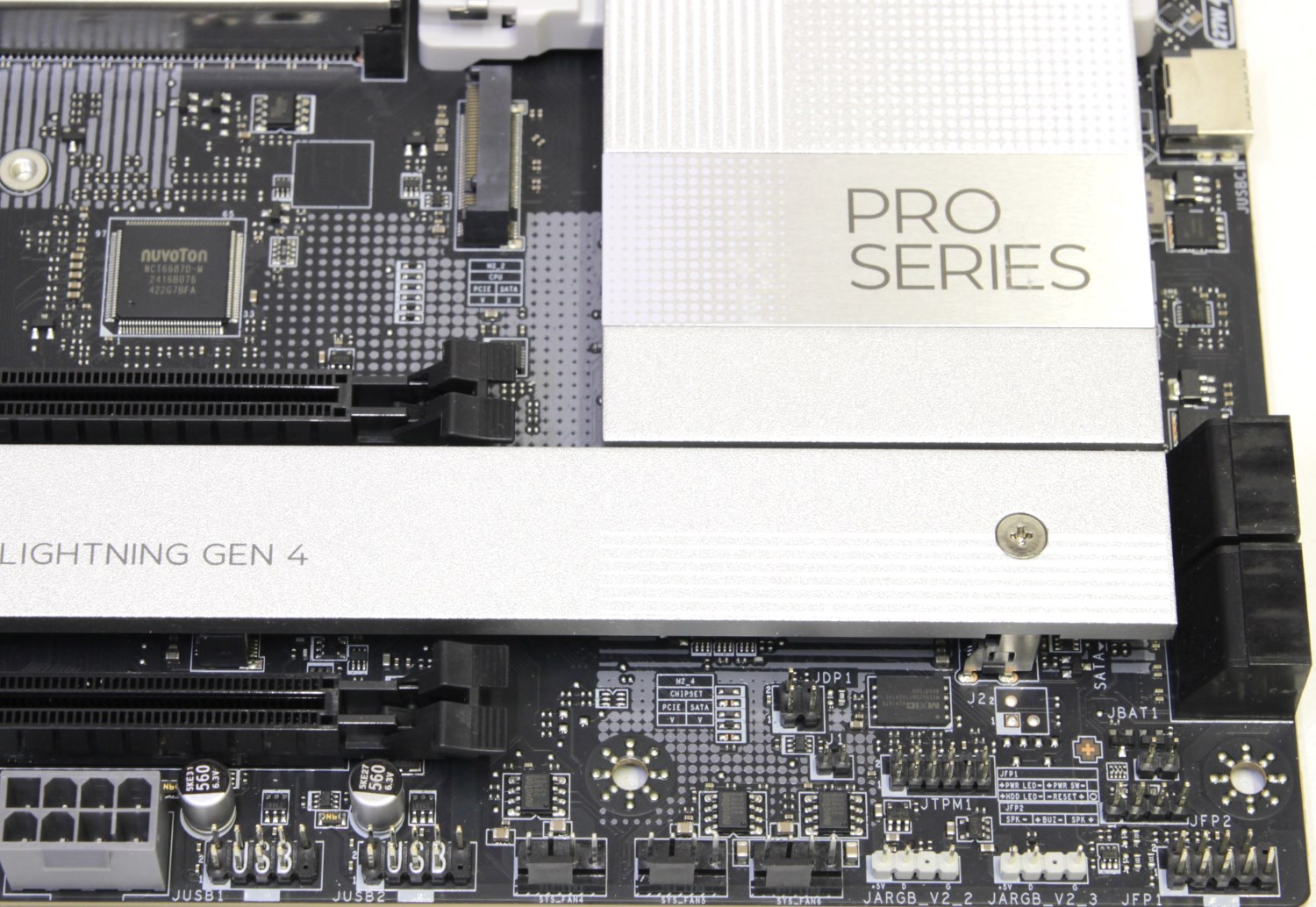 В левом нижнем углу находится отгороженное место для звуковой подсистемы. Здесь мы видим разъём для передней аудиопанели, звуковые конденсаторы, операционный усилитель и звуковой кодек Realtek ALC1220P. Между верхним и средним слотами PCI-e x16 размещен чип контроллера ввода/вывода и системного мониторинга Nuvoton NCT6687D. Выше по левому краю распаяна микросхема 5G сетевого контроллера Realtek RTL8126.