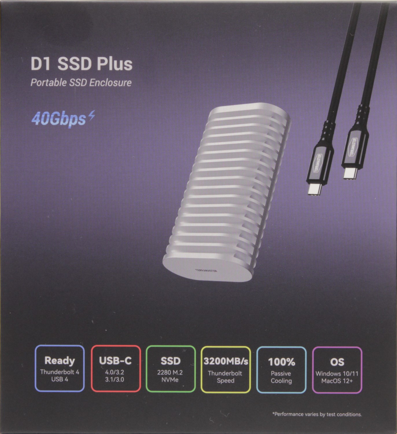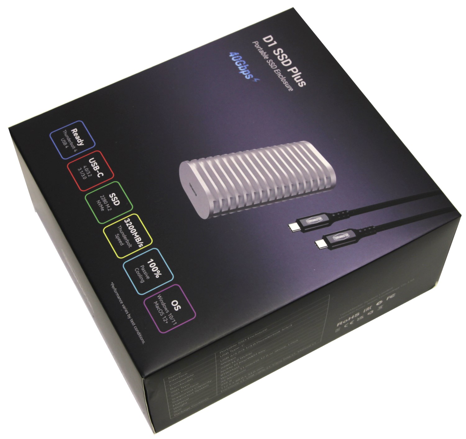 В левом верхнем углу указана модель устройства, а в самом низу размещена группа значков, которые перечисляют ключевые особенности устройства. Прежде всего это поддержка интерфейсов USB 4 и Thunderbolt 4. Также допустима работа в режимах совместимости с USB 3.2 Gen1, USB 3.2 Gen2 и USB 3.2 Gen2x2.