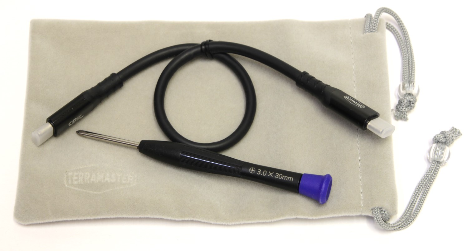 Комплект не очень большой. Есть короткий кабель USB Type-C - USB Type-C длиной около 20 см. Есть дополнительная термопрокладка, отвёртка и бархатный чехол бежевого цвета.