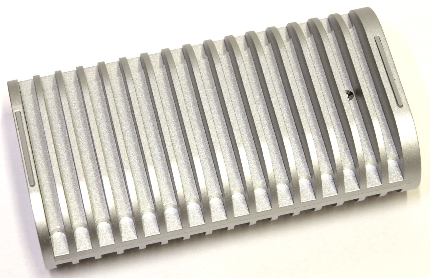 Устройство выполнено в форме эллиптического цилиндра. На самом деле форма его гораздо сложнее, сам цилиндр образуется только по внешнему периметру за счет ребер. Также это достаточно увесистый кусок алюминия. Разумеется, снаружи он чем-то окрашен, и чтобы не поцарапать его, в комплекте идет чехол.