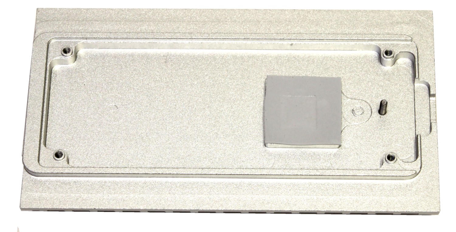 Крышка фиксируется одним-единственным винтом. Далее ее надо немного сдвинуть и можно увидеть, что она дополнительно фиксируется специальными выступами, которые вставляются в пазы. На верхней крышке при разделении остаётся только сама половинка корпуса, полость для размещения внутри накопителя и термопрокладка с защитной плёнкой.