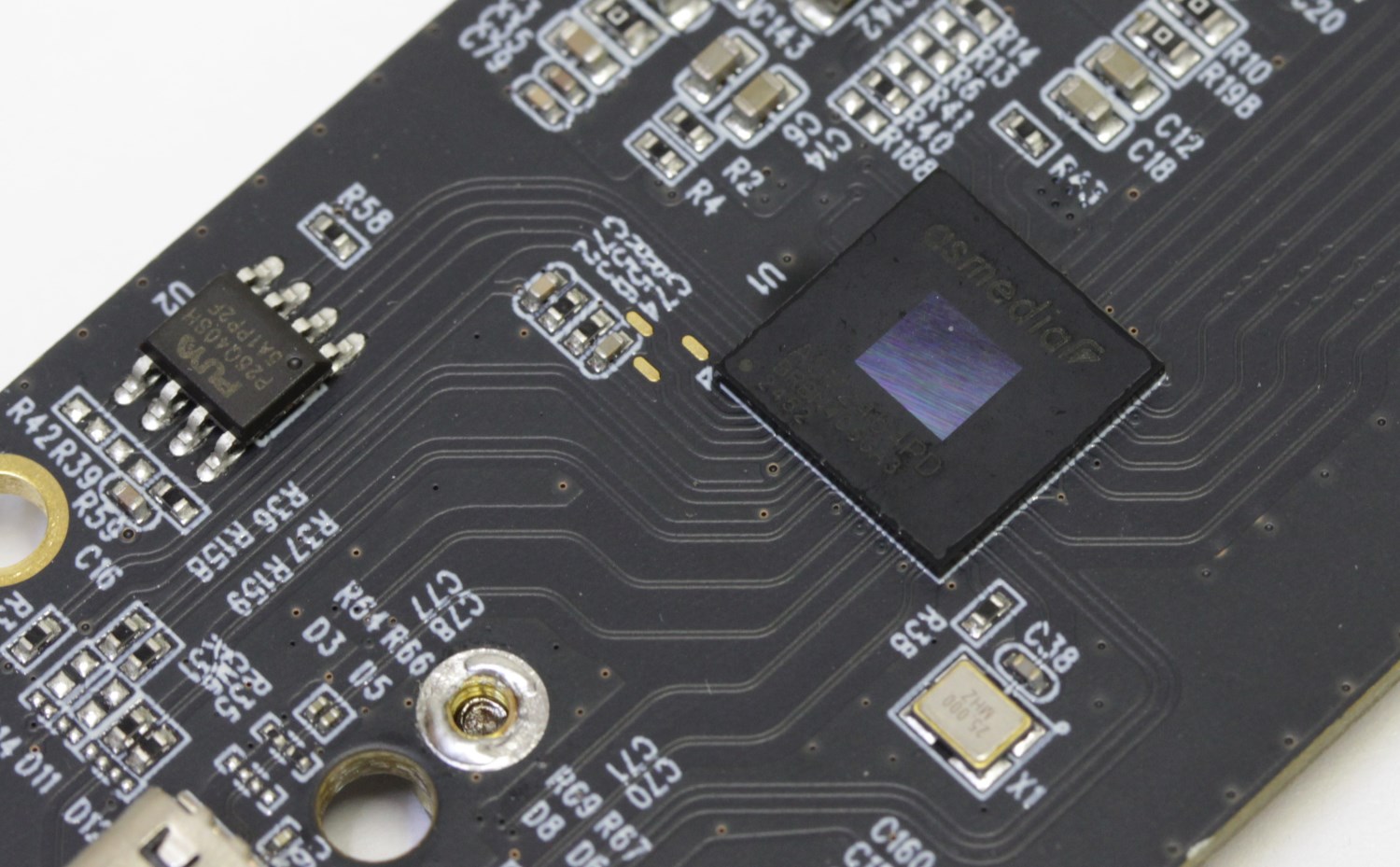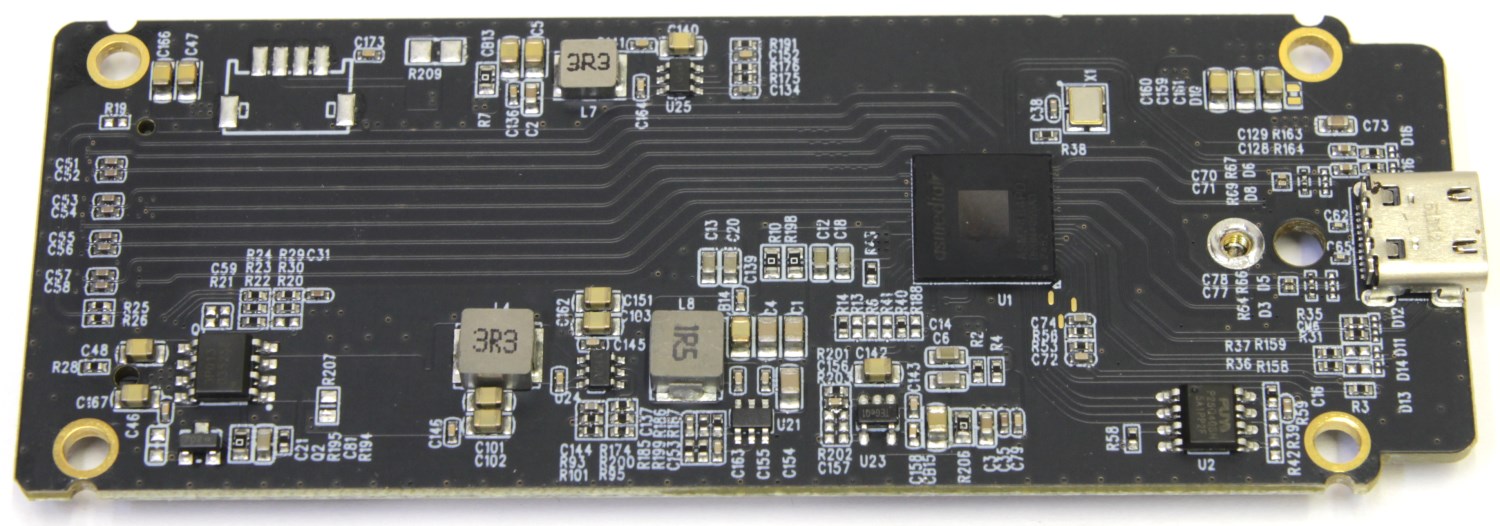 C противоположной стороны материнской платы размещен контроллер ASMedia ASM2464PD. По сути, это мост между интерфейсом PCI-e x4 Gen4 и USB 4.0/Thunderbolt. Чтобы получить максимальную скорость (~3500/3500 Мбайт/с) необходимо подключать комплектным или аналогичным кабелем к порту USB 4.0, Thunderbolt 4. При подключении к порту USB 3.1 скорость будет снижаться до предельно допустимой для данного типа пропускной способности (~1000 Мбайт/с), при подключении к порту USB 3.0, 3.1 Type-A - (~500 Мбайт/с).