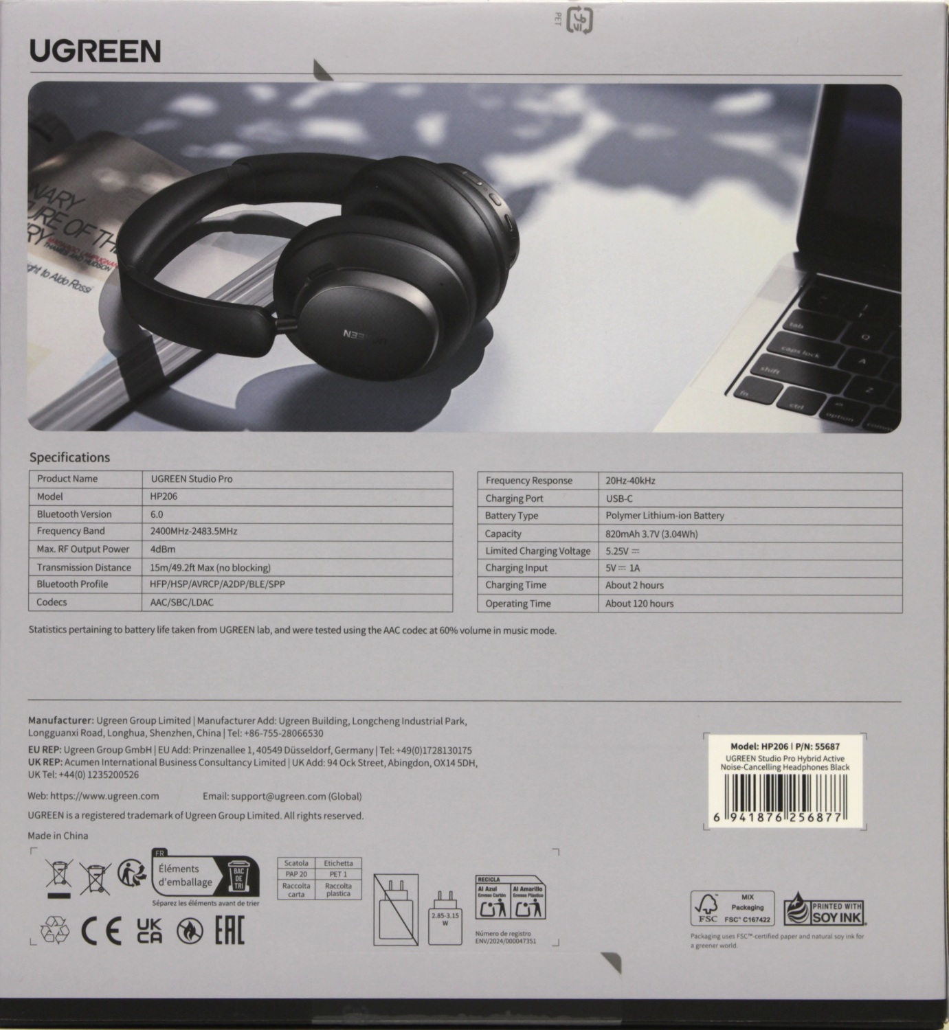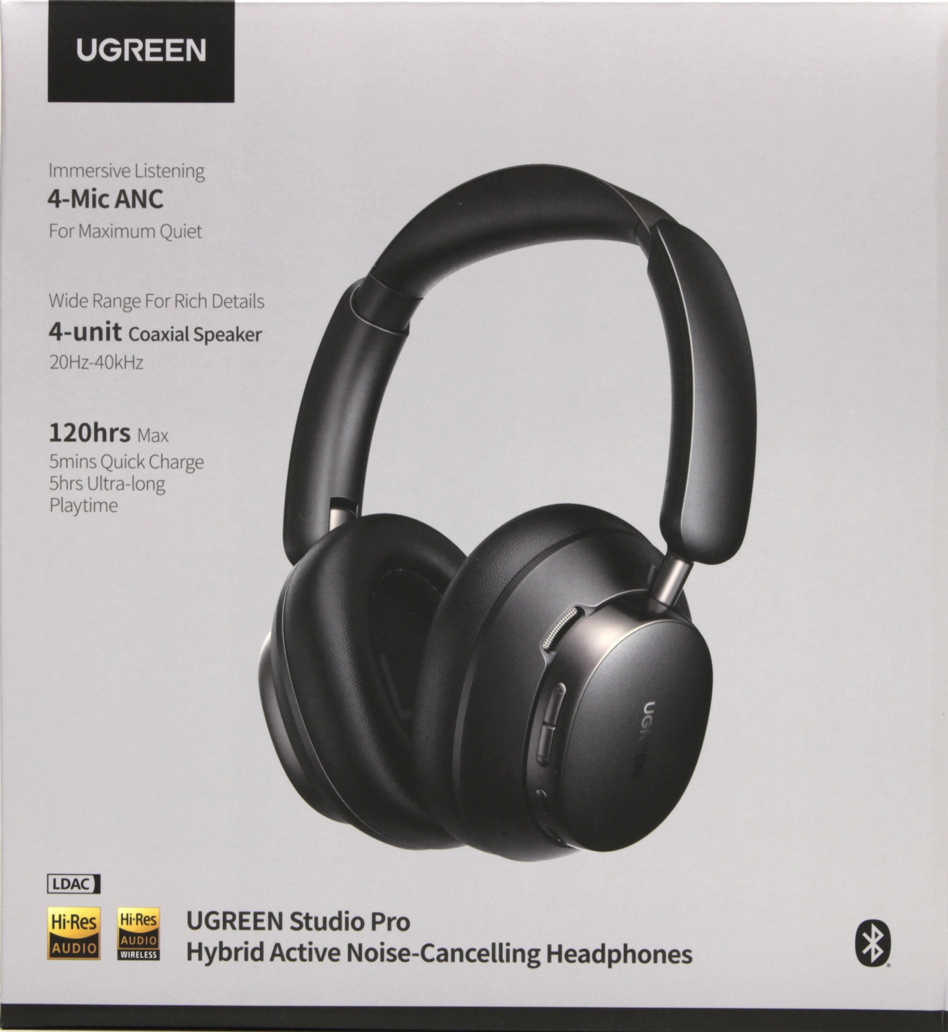 Упаковка средних размеров. Она изготовлена из плотного картона с цветной полиграфией. Модель Ugreen Studio Pro представлена в двух цветовых решениях. Я специально выбирал устройство в том числе и по этому параметру, чтобы люди могли различать свои наушники.