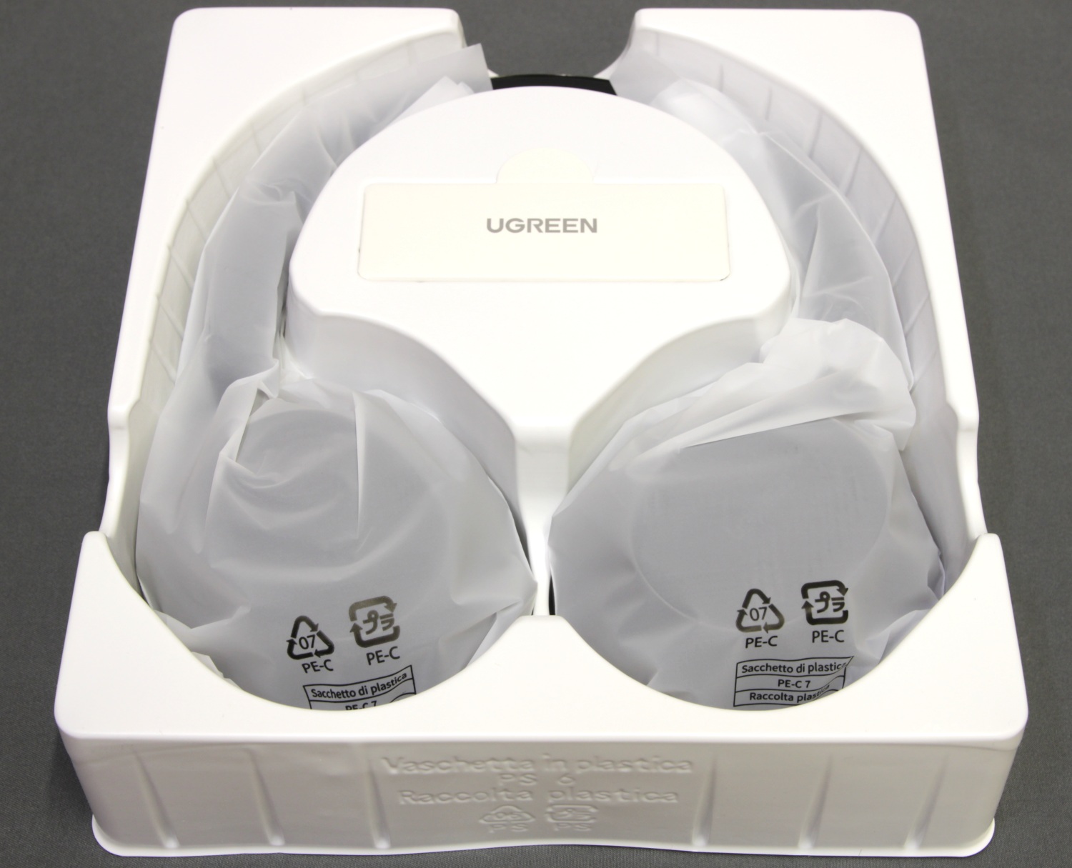 Здесь установлен пластиковый каркас, где в специальной нише, повторяющей форму устройства, размещаются сами наушники. По центру присутствует отсек с аксессуарами, который закрыт картонной вставкой. Каждая чашка дополнительно упакована в полиэтиленовый пакет. С обратной стороны в пакете лежат информационные носители.