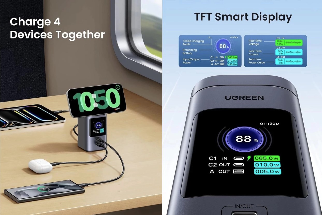 Ugreen Nexode 20000mAh 145W (PB771) – это не совсем обычный, но универсальный пауэрбанк, который может выручить в дальних поездках, когда точно известно, что электросети какое-то время не будет, а подзаряжать мобильные устройства нужно. Это отличный вариант, чтобы продлить рабочее время смартфона, ноутбука или электронных часов. Например, можно по беспроводной зарядке заряжать часы, по одной линии смартфон, а по другой ноутбук. 145 Вт – это именно максимальная отдача этого пауэрбанка для зарядки.
