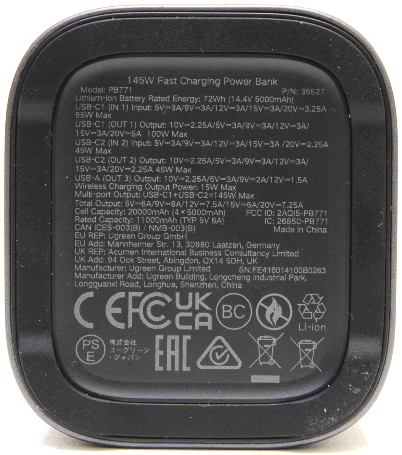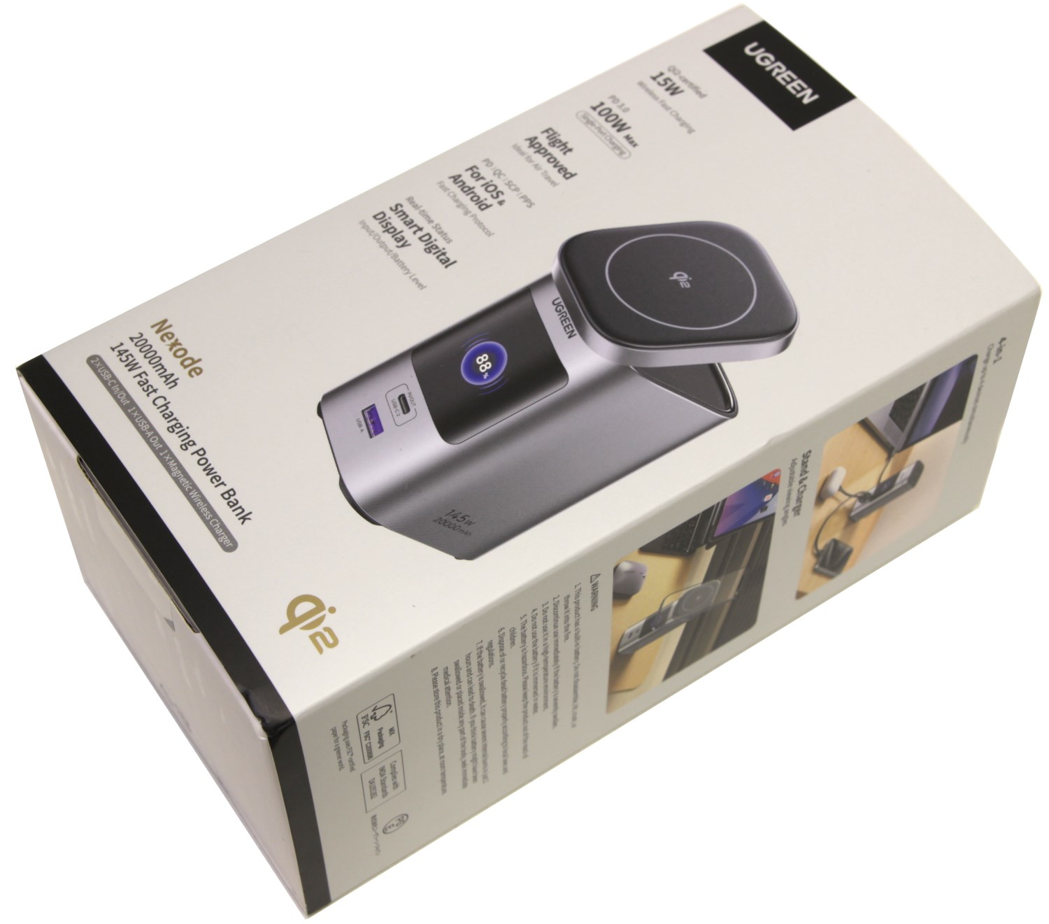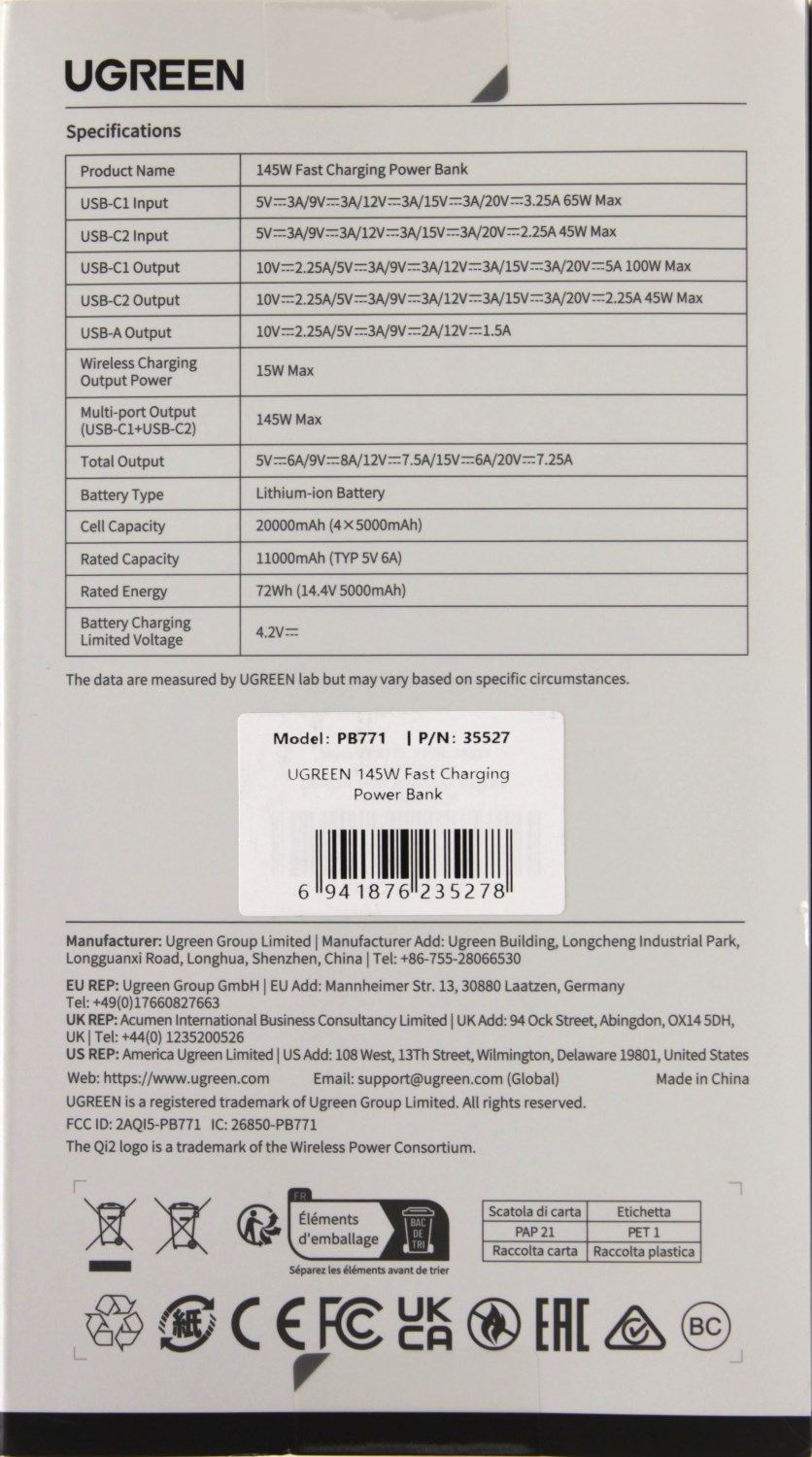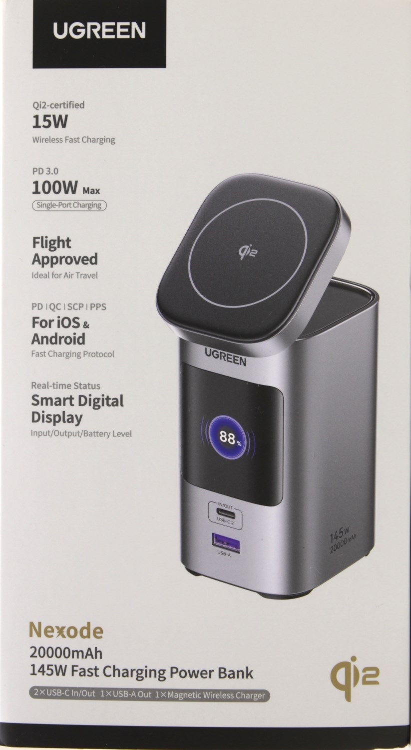 Снизу указана модель Ugreen Nexode Power Bank 20000mAh 145W, также уточняется, что это пауэрбанк со скоростной зарядкой. Тут же приведена его ёмкость, которая составляет 20 000 мАч. В правом нижнем углу есть значок, который указывает на стандарт беспроводной зарядки Qi2.
