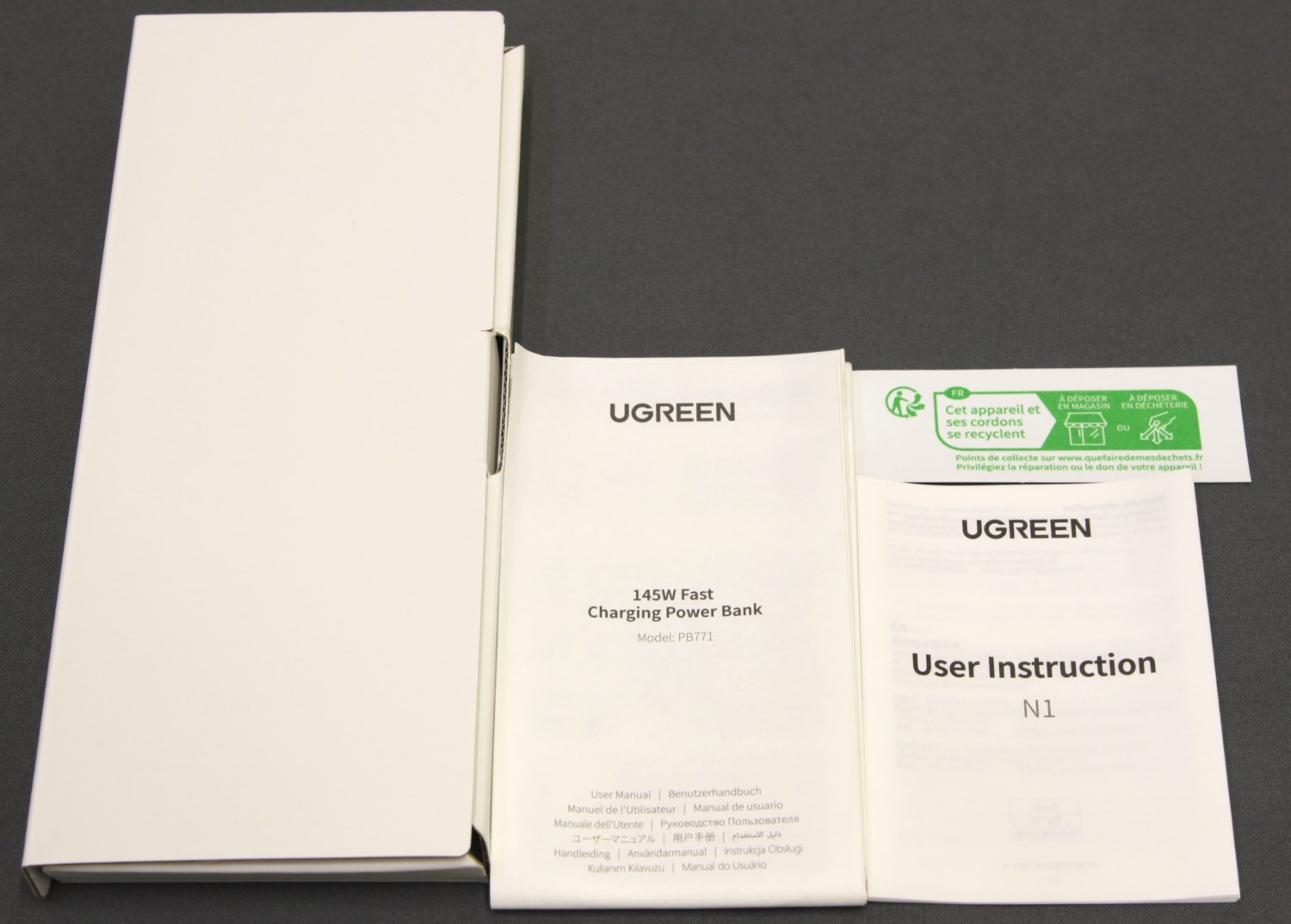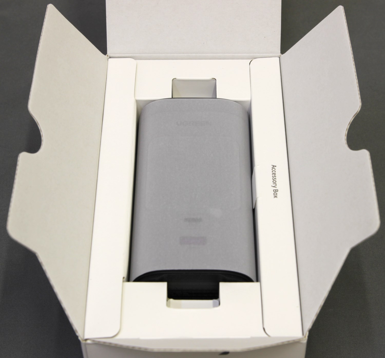 Ugreen Nexode 20000mAh 145W (PB771) поставляется в небольшой коробке из плотного картона с цветной полиграфией. Спереди можно заметить изображение самого устройства. Выглядит оно как прямоугольная колонна с откидной крышкой и экраном. На нём отображается анимация, уровень заряда устройства и мощность заряда по проводным линиям.