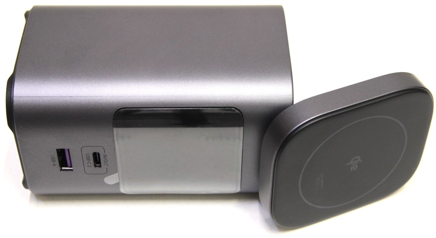 Устройство представляет собой небольшой пластиковый брусок с экраном и откидной крышкой. Конструкция предусматривает вертикальную установку, поскольку снизу есть специальные ножки. Откидная крышка, скорее всего, необходима для подзарядки смарт часов или фитнес браслетов, которые поддерживают беспроводную зарядку. Обычный смартфон гораздо удобнее заряжать в горизонтальном положении. Причём верхняя крышка открывается не на 90°, а где-то на 75°.
