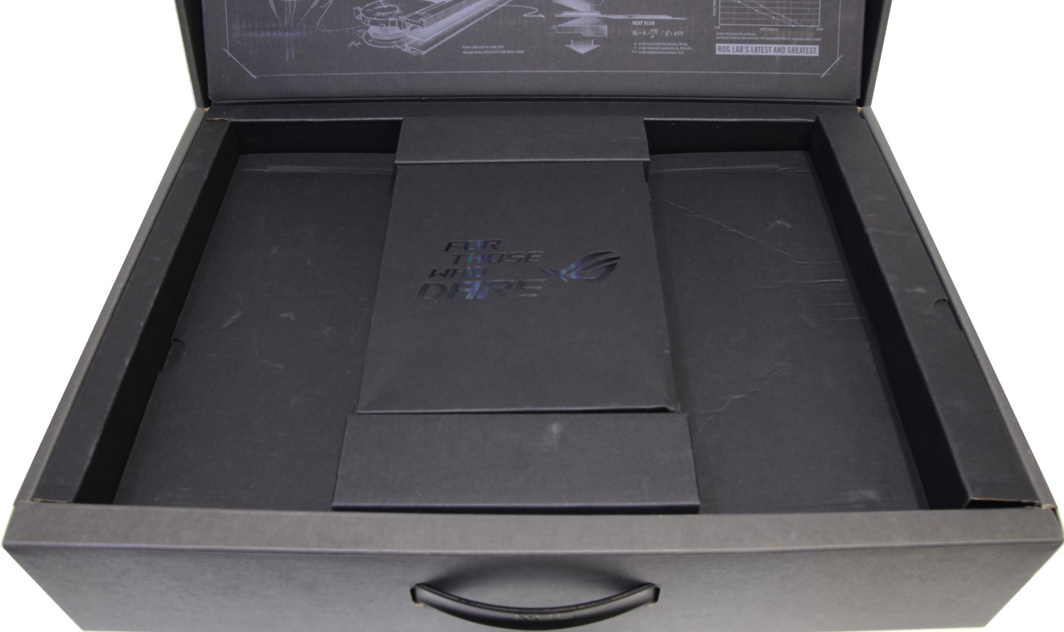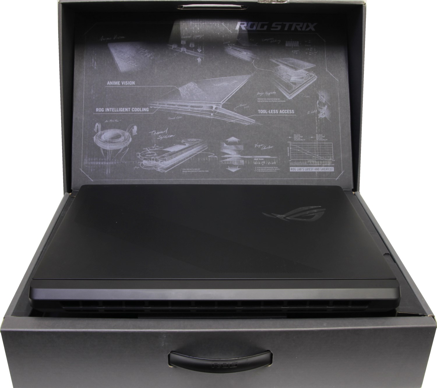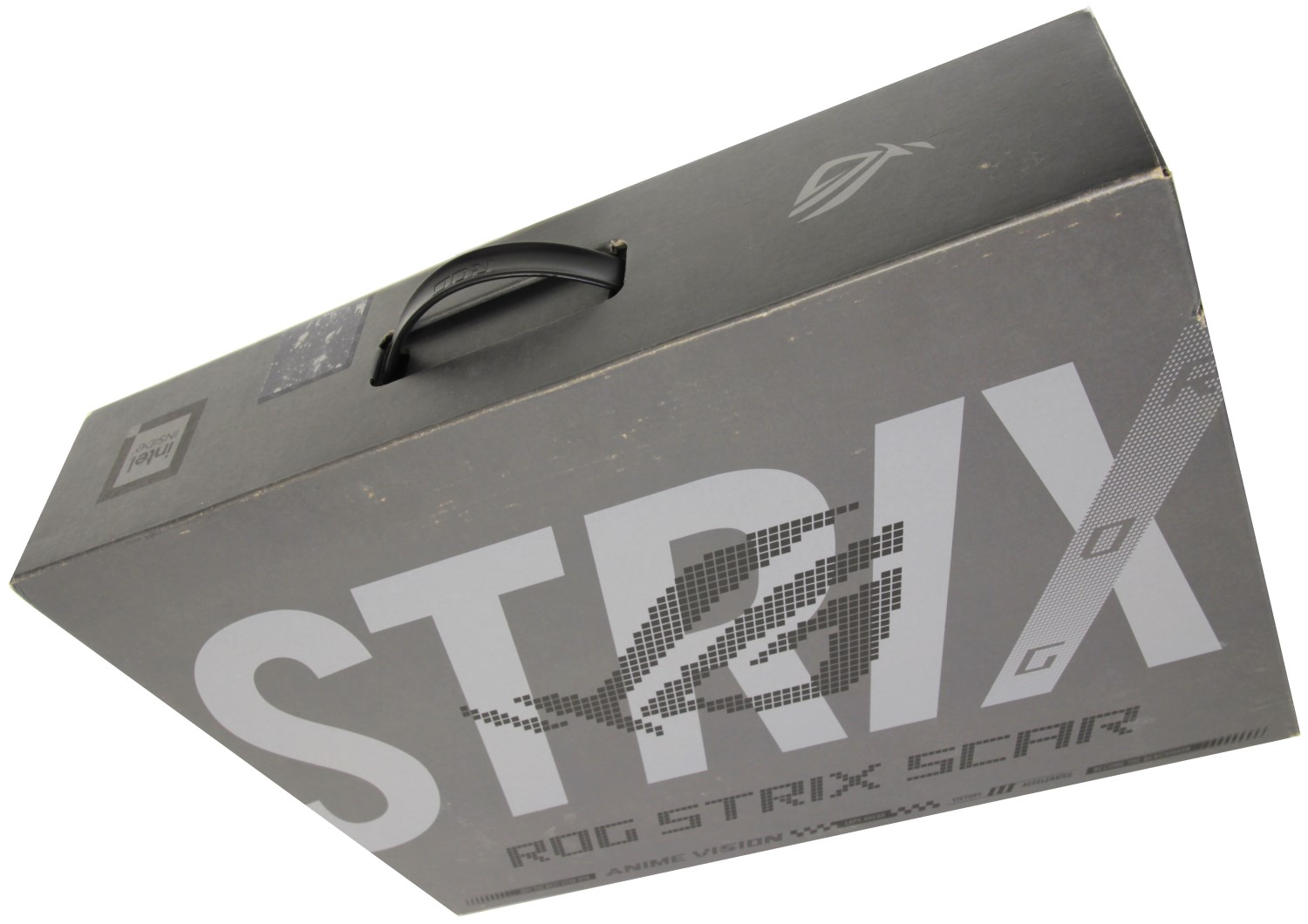 Ноутбук поставляется в крупной картонной коробке. С одной стороны находится чёрный логотип ROG и крупная красная надпись Strix. Сверху предусмотрена чёрная пластиковая ручка для транспортировки.