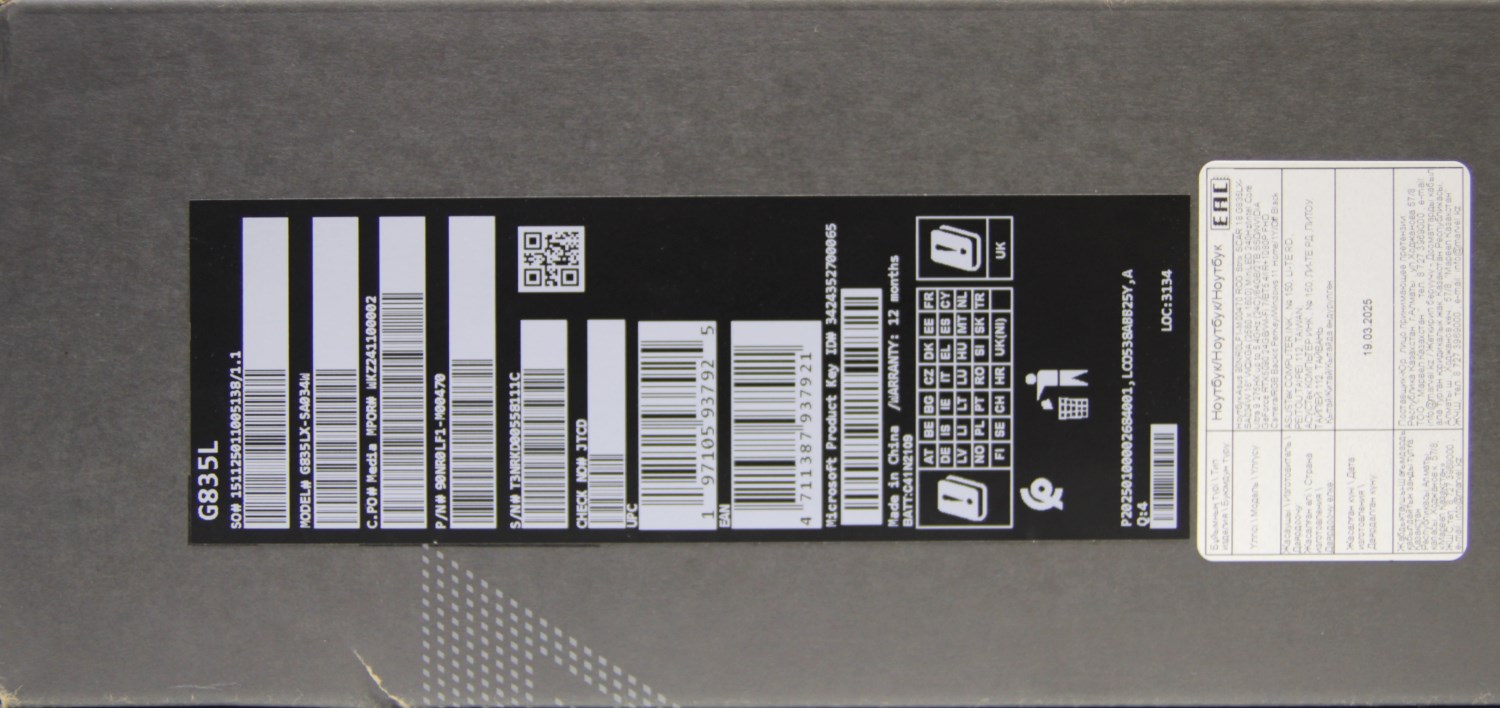С одного из торцов коробки есть похожая наклейка. Подробной информации традиционно нет. Можно выяснить модель процессора и объём памяти. Даже модель GPU тут можно примерно вычислить лишь по объёму видеопамяти.