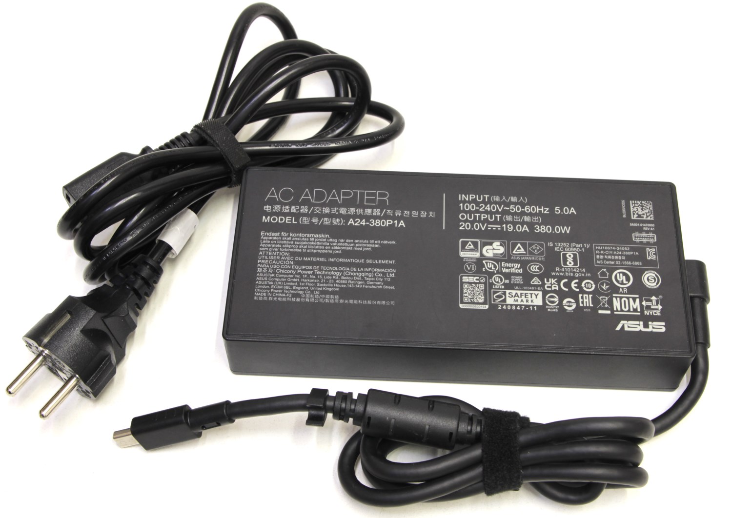 В комплекте поставки идет один огромный блок питания на 20 В и 19 А, что обеспечивает аж 380 Вт. Это заявка на рекорд. Разъём проприетарный, он прямоугольной формы, но заметно крупнее Type-C.