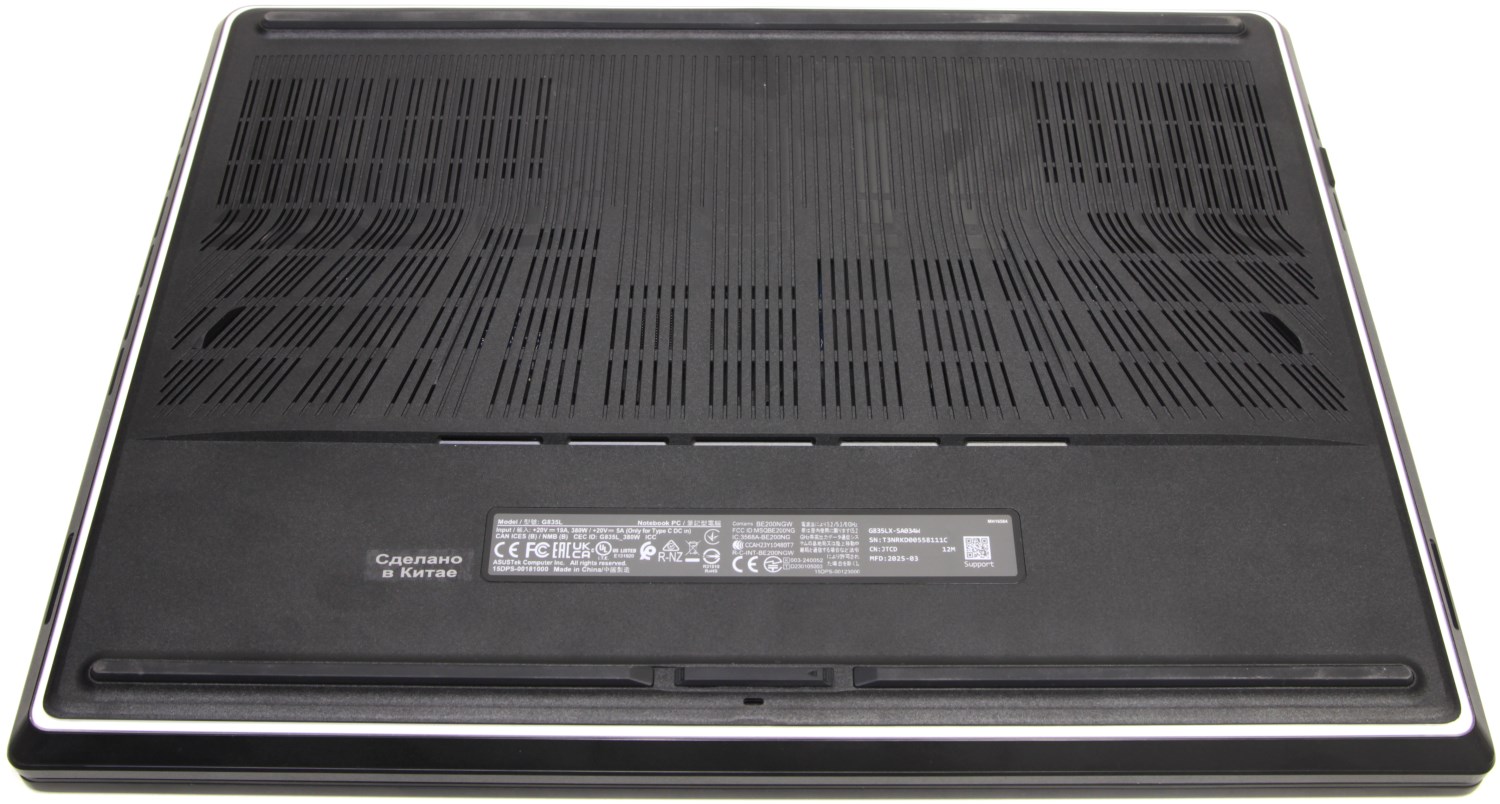 Тыльная сторона изготовлена из пластика. На ней есть несколько резиновых ножек разной формы. Стоит ноутбук на ровной поверхности очень устойчиво. По периметру нижней части корпуса проходит светодиодная ARGB лента.