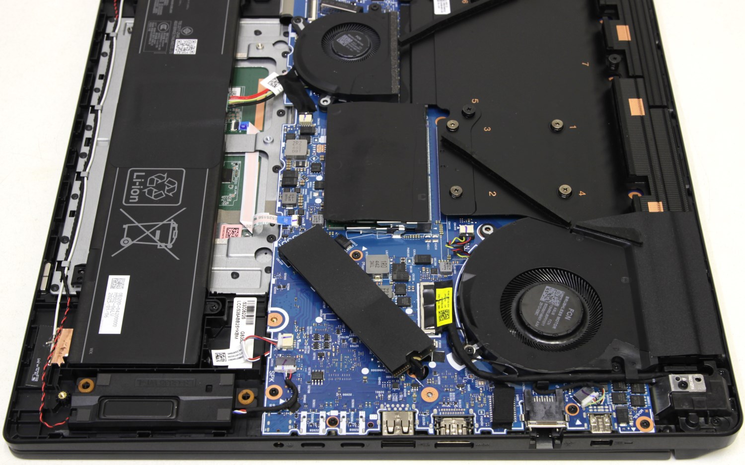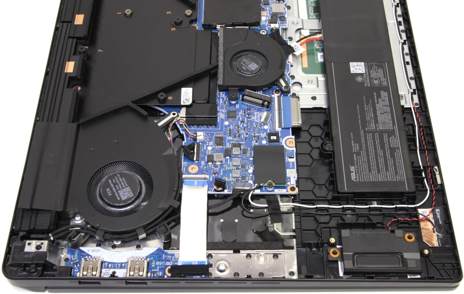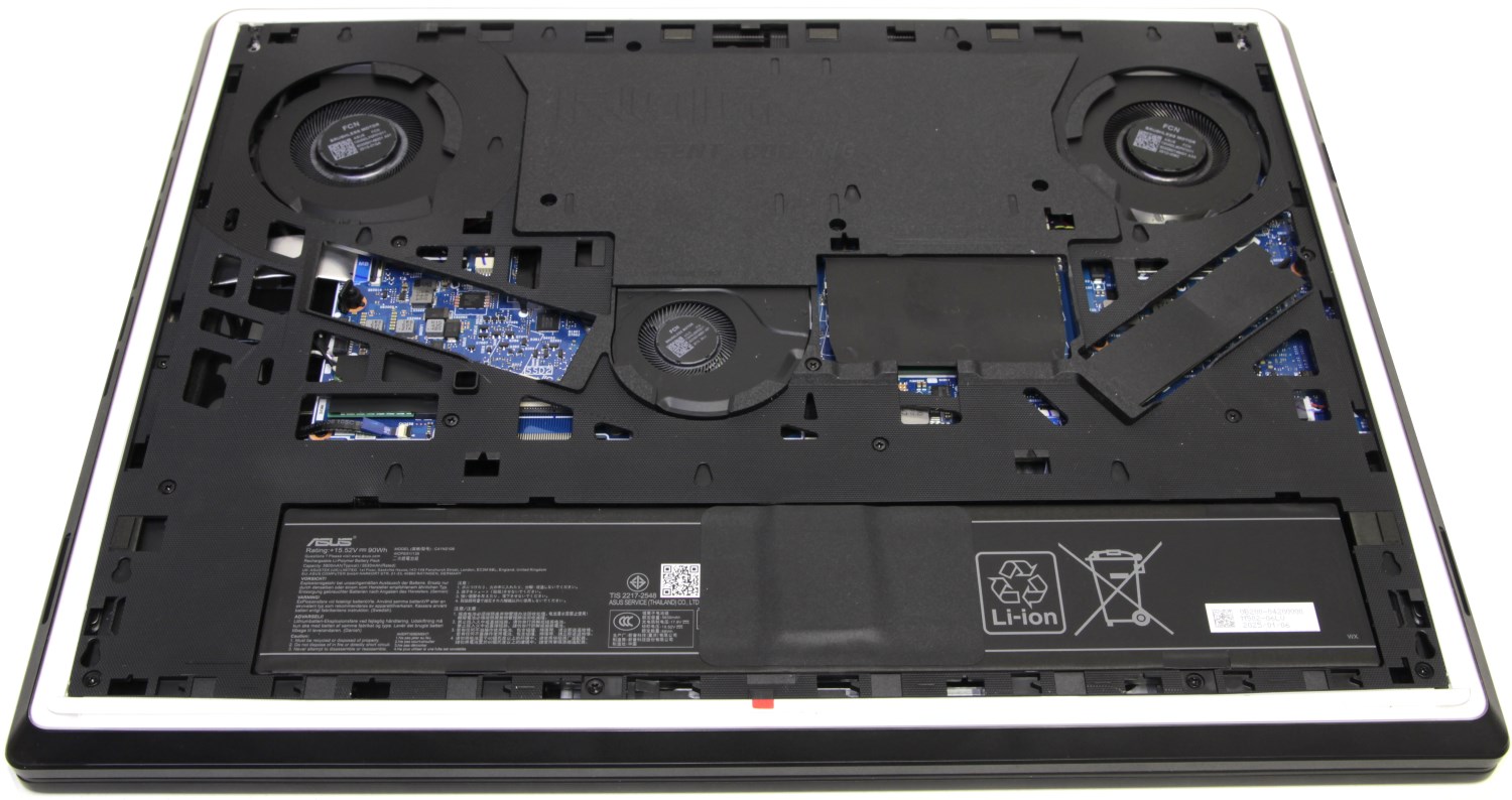 Модель крупная, поэтому есть немного свободного места. Основную часть внутреннего пространства занимает система охлаждения. В этом нет ничего удивительного, поскольку у данного устройства очень мощная начинка. Сама система выглядит необычно, особенно крупная пластина, которая частично закрывает обзор компонентов.