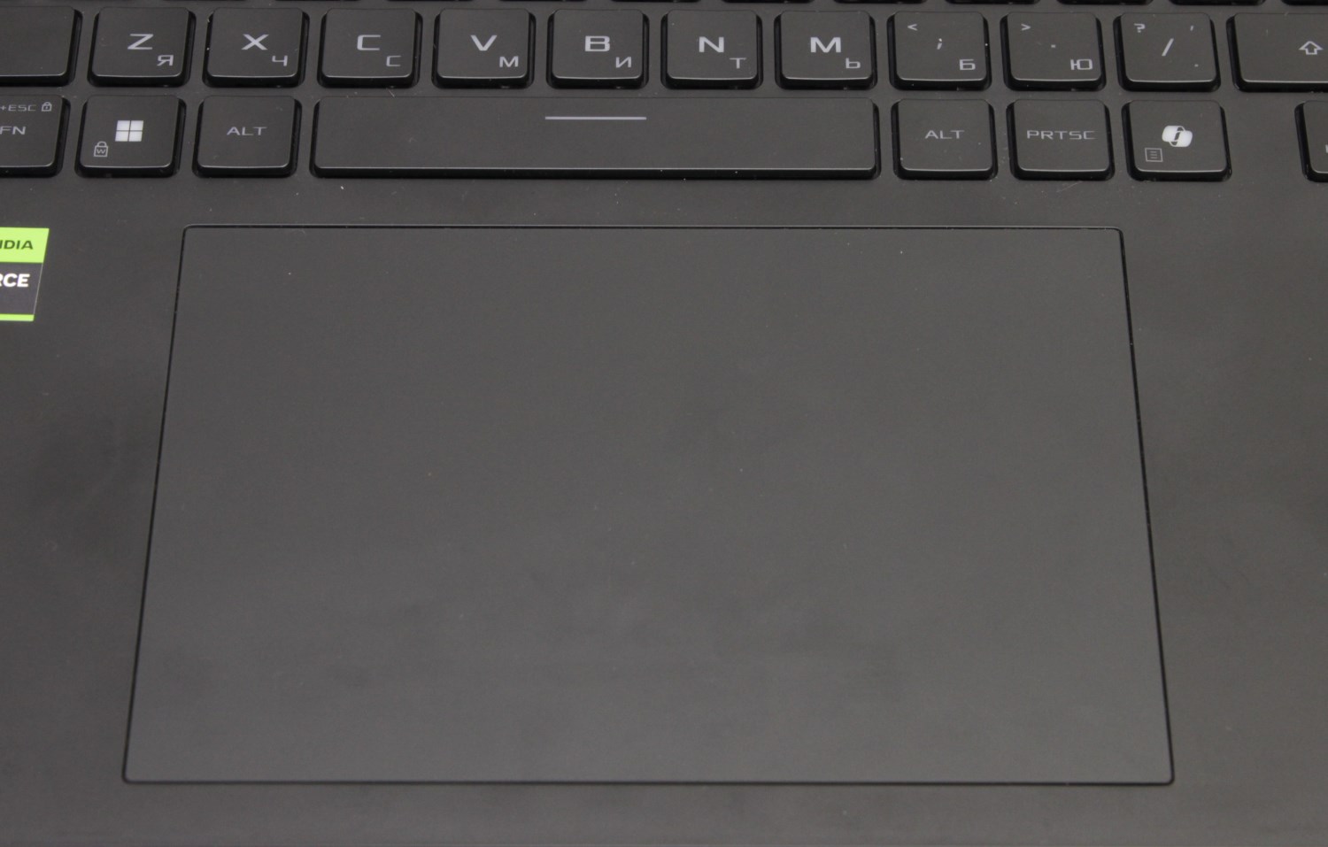 Большой стеклянный тачпад с габаритами 150.3 x 98.8 мм обеспечивает плавный и точный одно- или многосенсорный ввод. Он расположен внизу по центру. Отдельных кнопок нет, они традиционно встроены под панелью по нижним углам.